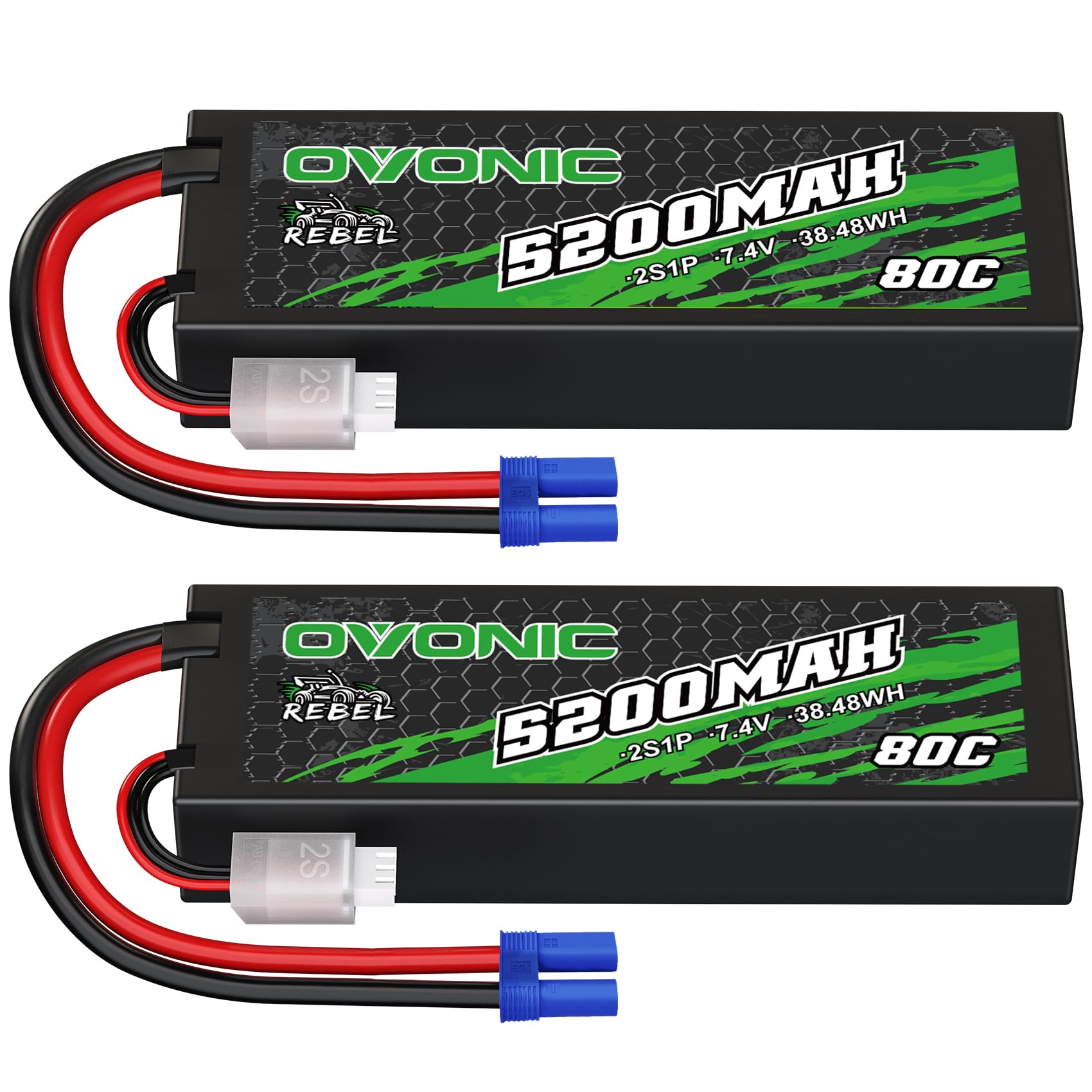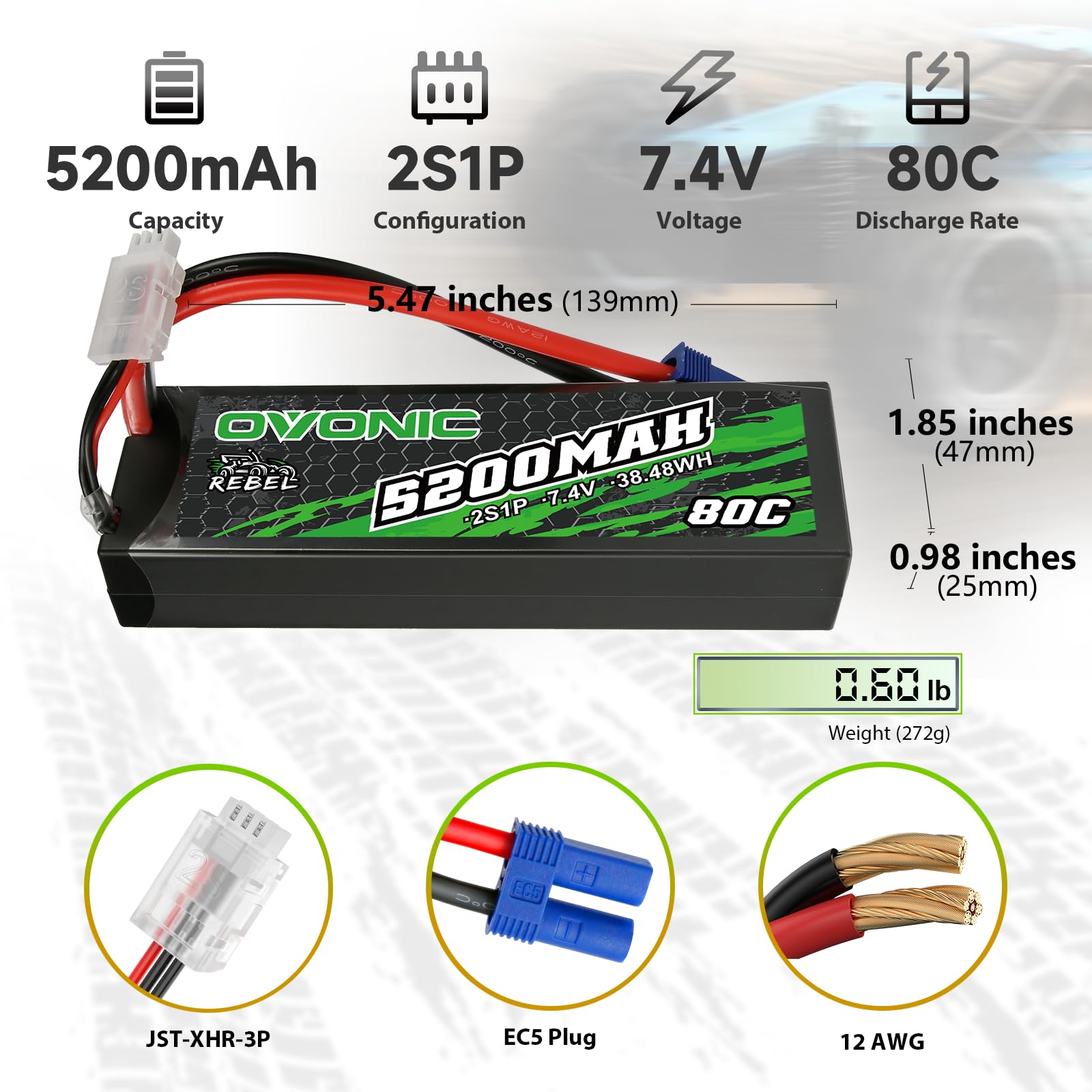- Q: What are the specifications of the OVONIC 80C 2S 5200mAh Lipo Battery? A: The OVONIC 80C 2S 5200mAh Lipo Battery features a voltage of 7.4V, a minimum capacity of 5200mAh, and a discharge rate of 80C. It includes an EC5 connector and has dimensions of 138.5*46.5*24.5MM, weighing 248g.