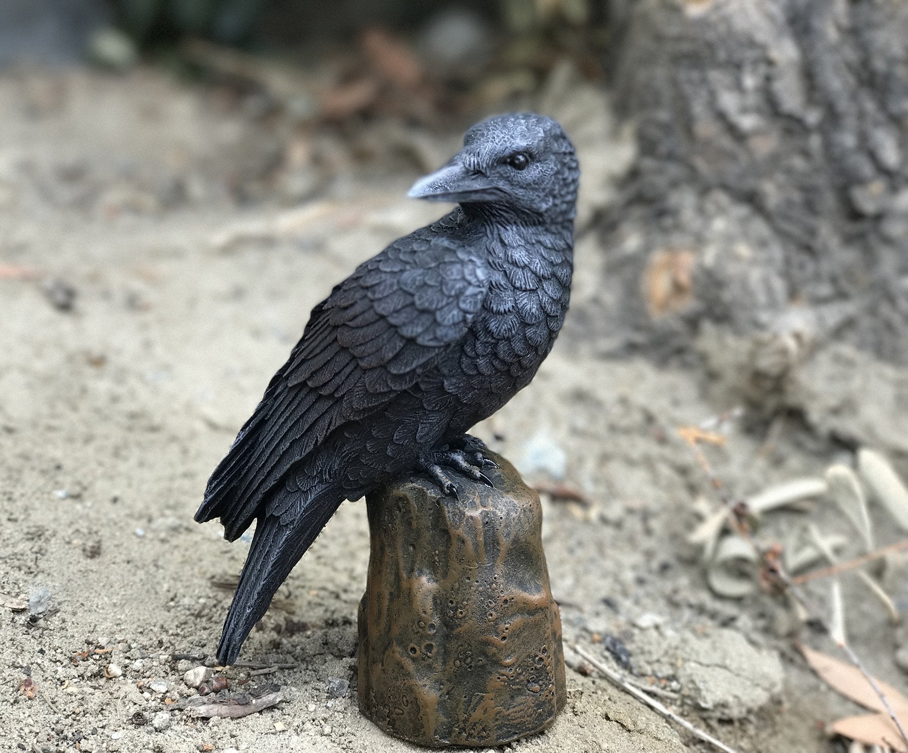 Beautiful sculpted raven/crow with lifelike colors made of high quality resin. Measures 6 inches tall