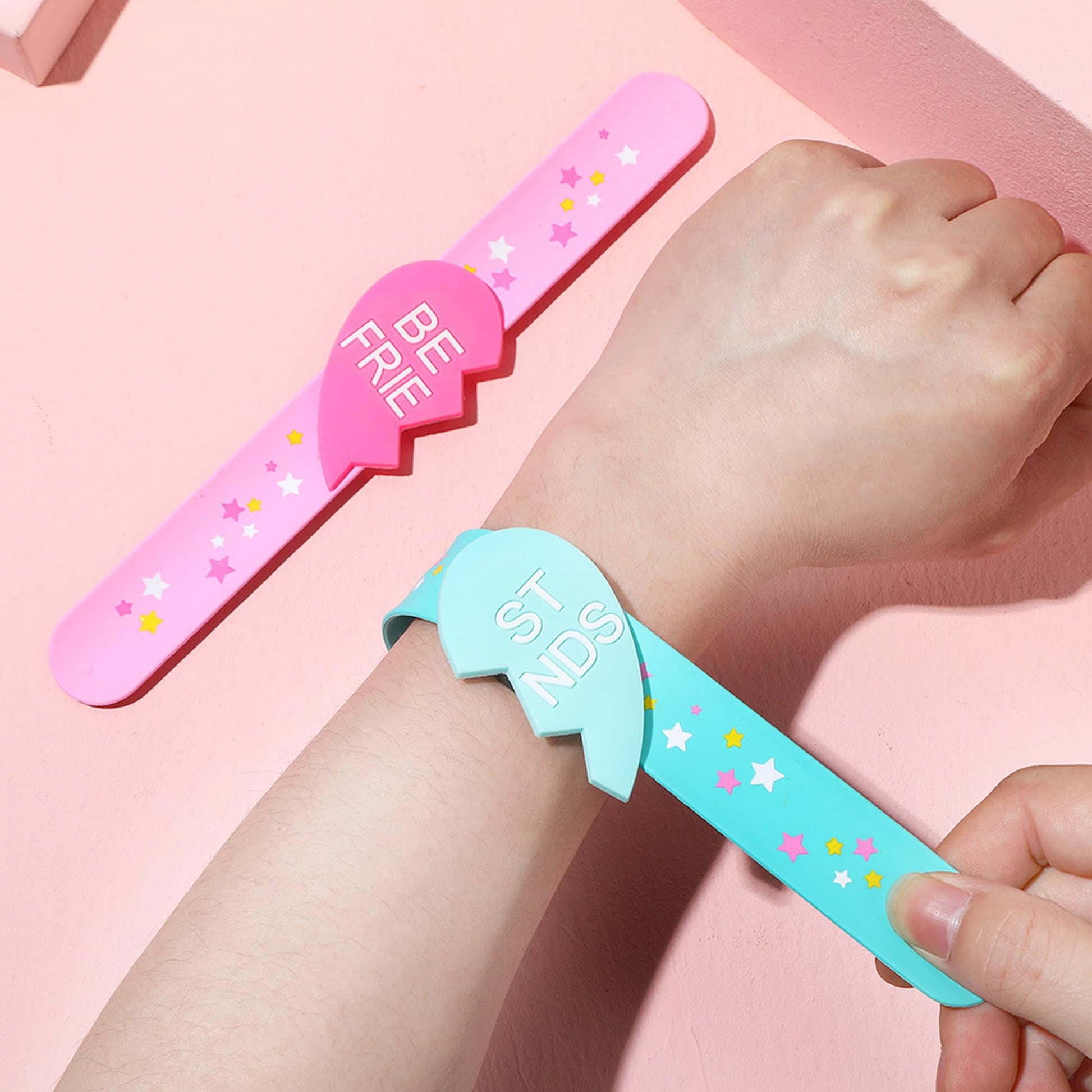 • Q: How are the slap bracelets made and what materials are used? A: These slap bracelets are made from high-quality food-grade silicone rubber, ensuring they are soft, non-toxic, and safe for children. The durable material allows for long-lasting use and easy cleaning with water.