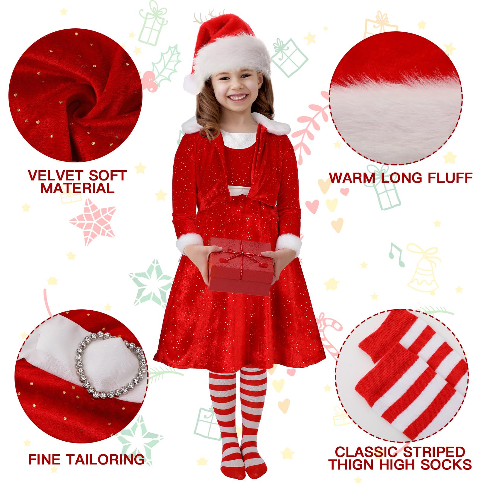 Panitay 4 Pcs Girls Christmas Costume Red Santa Claus Outfit Hat Jacket Dress Tights For Little Girls Kids Holiday Cosplay (Medi