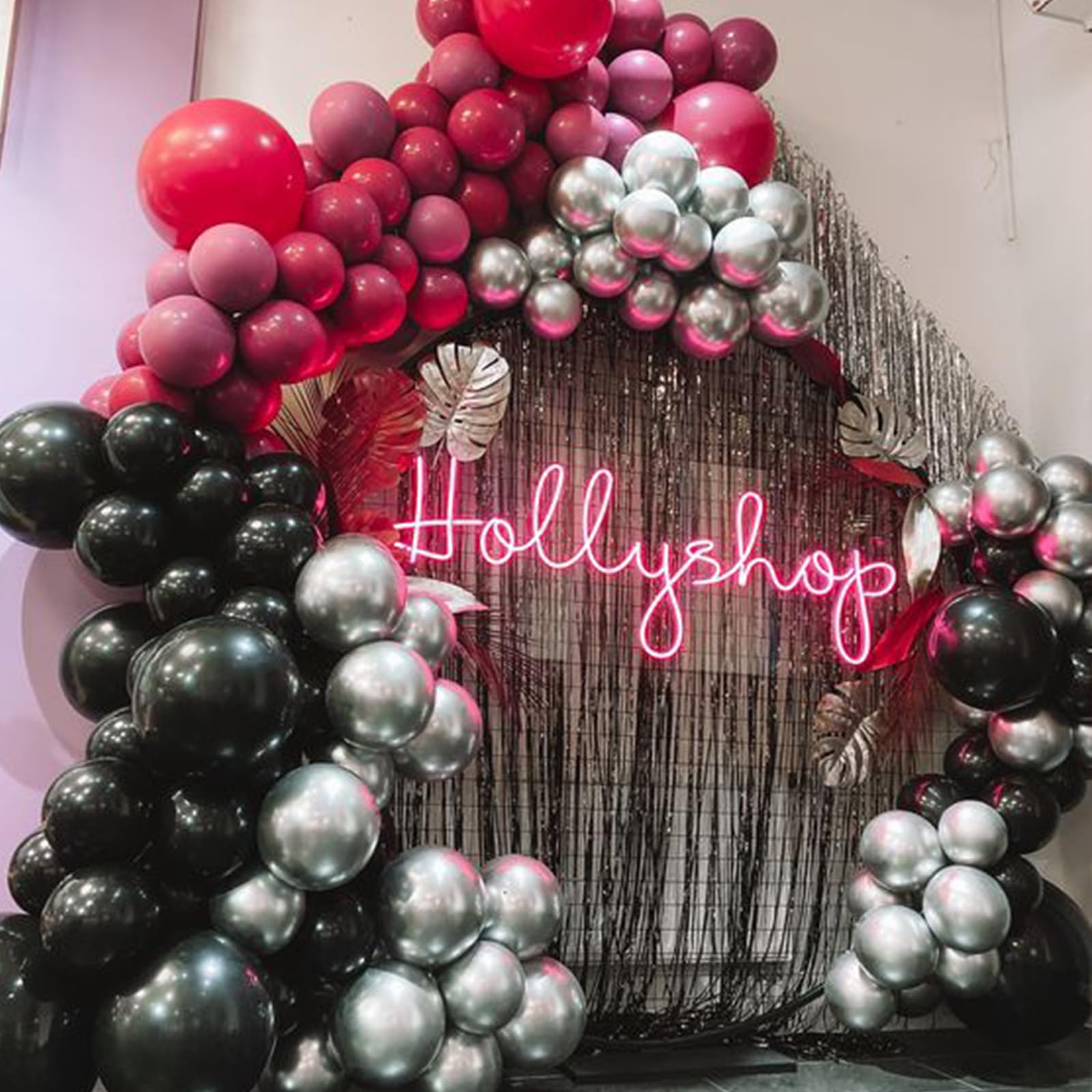 - Q: What colors are available in this balloon set? A: This balloon set features hot pink, black, and metallic silver colors. These vibrant colors enhance your party atmosphere.