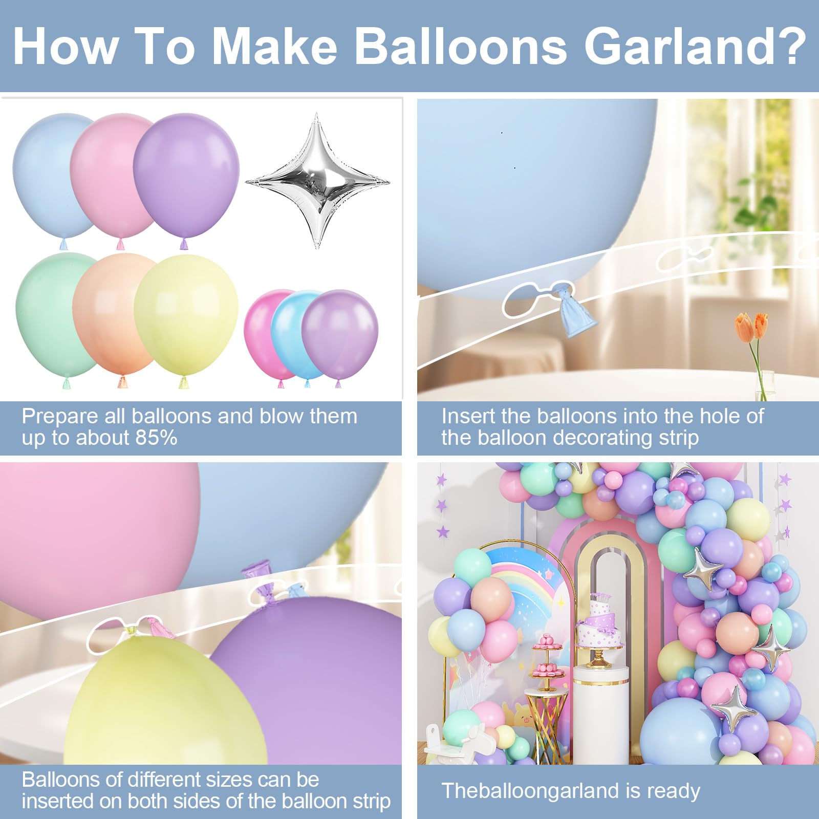 - Q: How do I assemble the pastel rainbow balloon garland? A: Assembling the pastel rainbow balloon garland is easy. Inflate the balloons to different sizes, secure them with knot ties, and attach them to the wall using tape or glue dots. This allows you to create a stunning balloon arch that enhances your party decor.