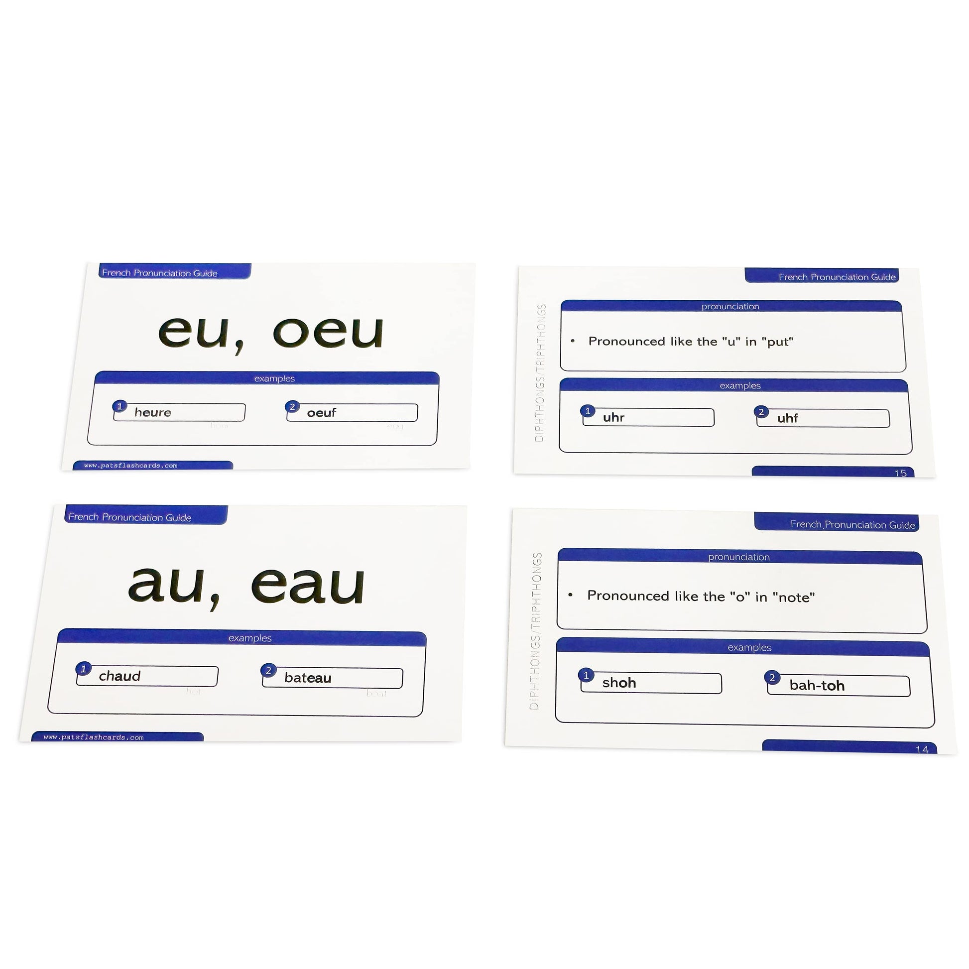 • Q: What are Pat's Flash Cards and how can they improve my French pronunciation? A: Pat's Flash Cards are a set of 49 flash cards designed to help learners improve their French pronunciation. Each card features a French pronunciation rule on the front, along with examples, and an English explanation on the back, making it easier to grasp complex sounds.