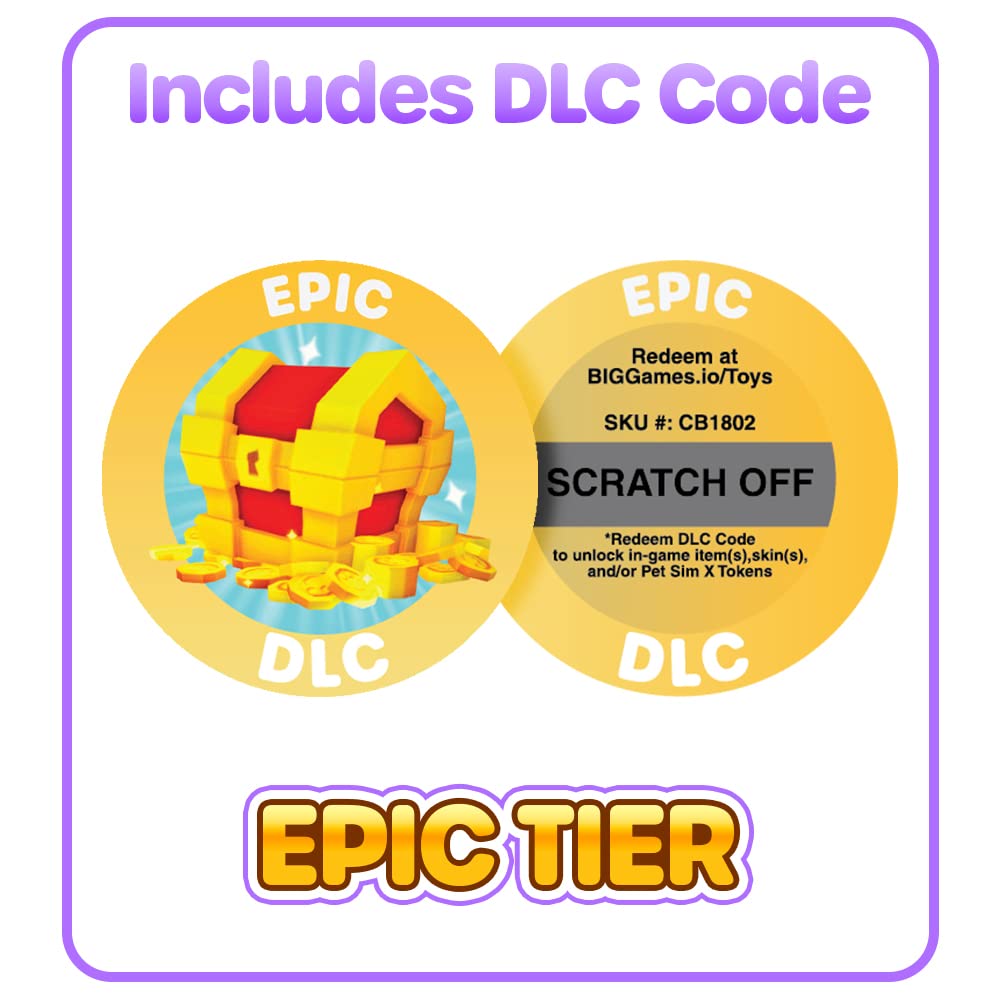 - Q: What is included with the PET Simulator - Mystery Pet Treasure Plush? A: The PET Simulator - Mystery Pet Treasure Plush includes a mystery plush toy, individual pet name tags, and a DLC code that provides Epic Tier in-game rewards.