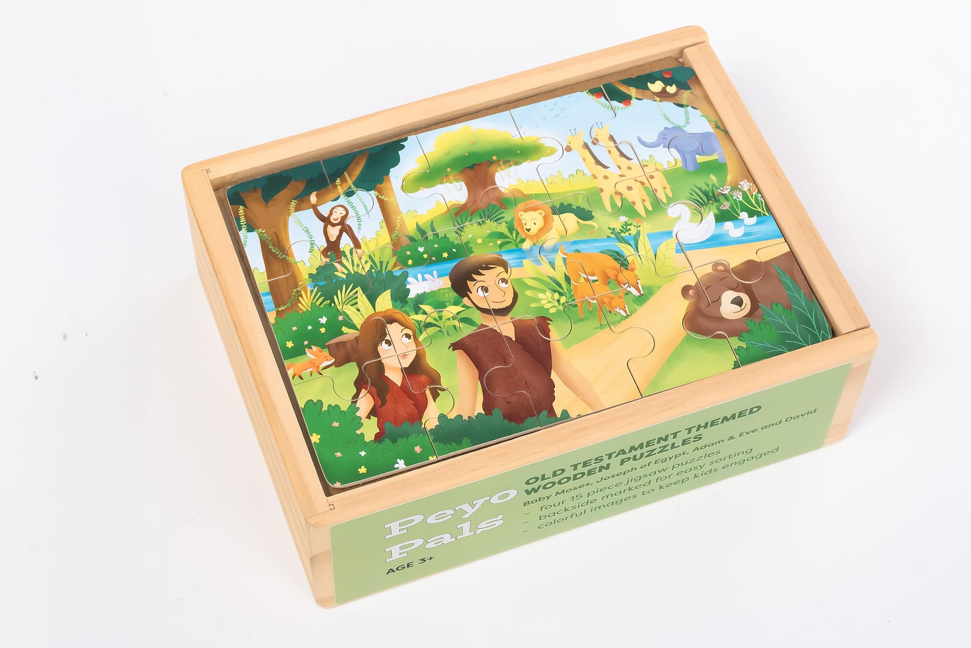 Peyo Pals Bible themed wooden puzzles uses beautiful, colorful and kid-friendly imagery to introduce gospel stories to children. Wooden eco-friendly box contains 4 jigsaw puzzles: 1. Adam and Eve 2. Joseph and the Coat of Many Colors 3. Pharaohs Daughter Finds Moses 4. David and Goliath Sturdy wooden box works as a storage box which makes it handy for easy cleanup, organization and portability. The wooden lid doubles as a puzzle board. Each puzzle piece includes shape-codes on the back for easy sorting. Back side of the storage box has all Bible scene images for easy reference while your little ones are at play.