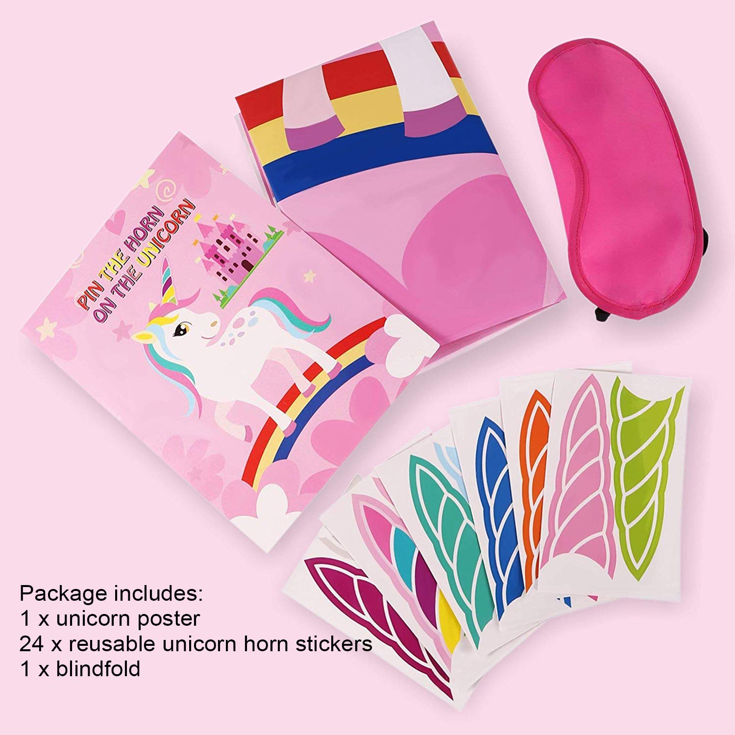 Features: The Pin The Horn On The Unicorn Game Is Suitable For Children'S Birthday Parties, Unicorn Theme Party, School Activities, Family Gatherings Which Can Bring More Fun To The Party Games For Kids. Specifications: Size: 28 X21 Material: Made Of High Quality Poster Paper With Glossy Bright Coating. Package Includes: 1Pc Unicorn Party Game Poster(28''X21'') 2Pc Blindfold 24 Reusable Horns Sticker 20 Dot Stickers