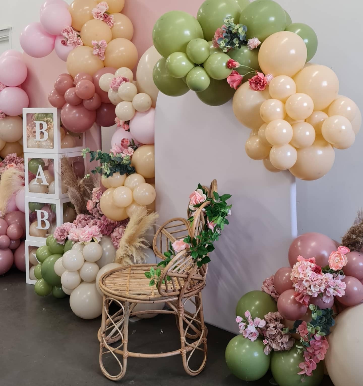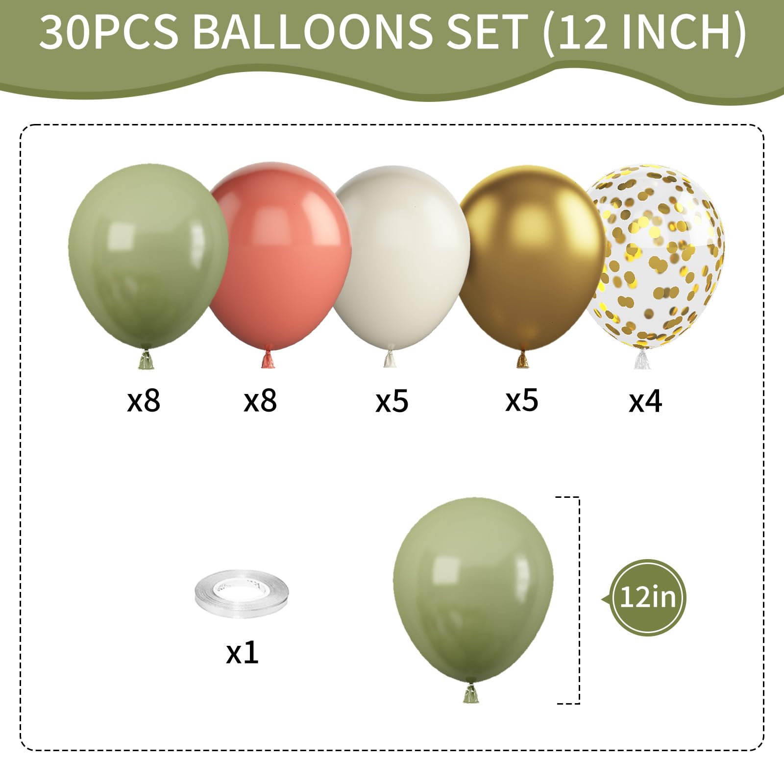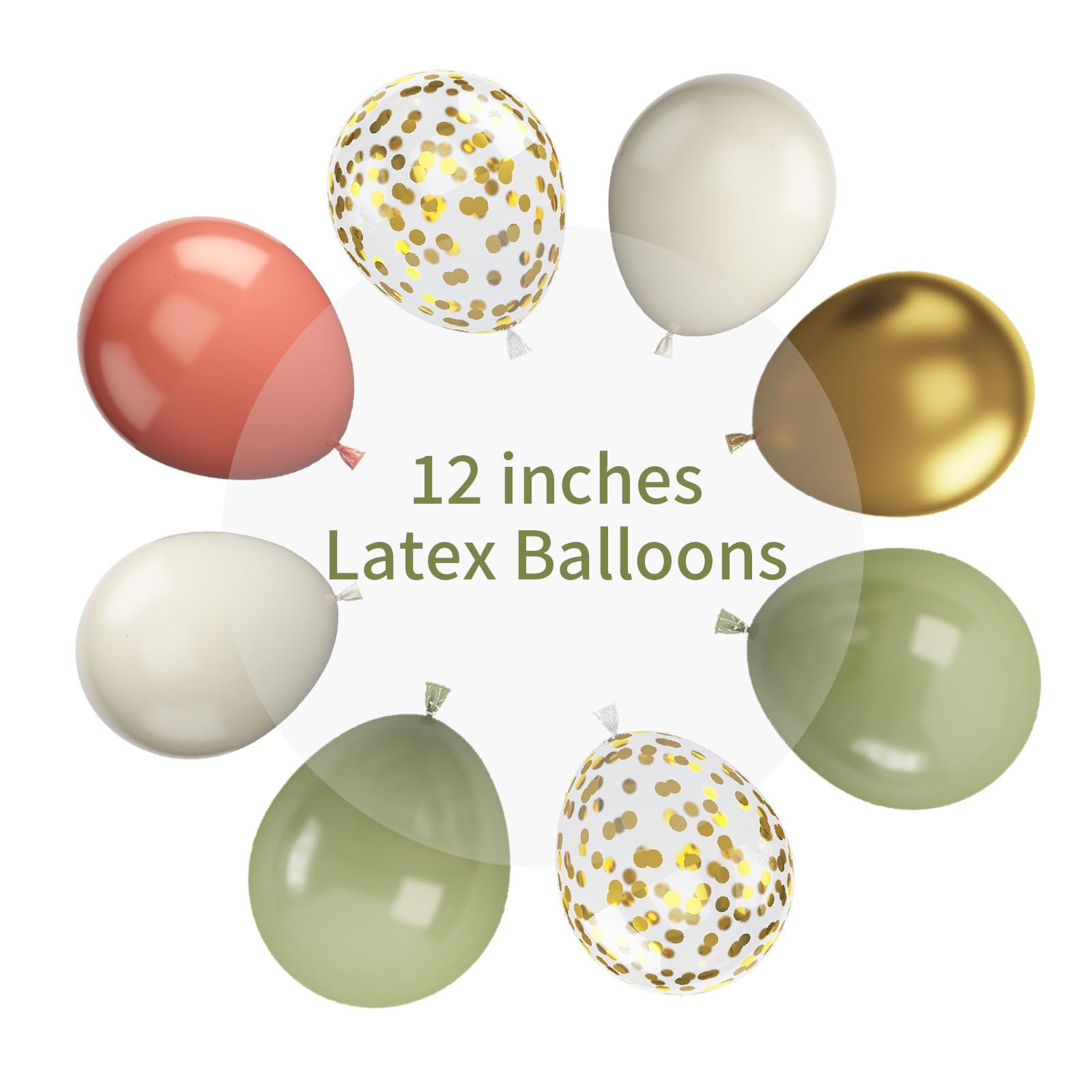 - Q: What colors are included in the Pink and Green 12 Inch Balloons Set? A: The set includes a variety of colors: sage green, dusty pink, metallic gold, olive, and sand white, along with confetti balloons.