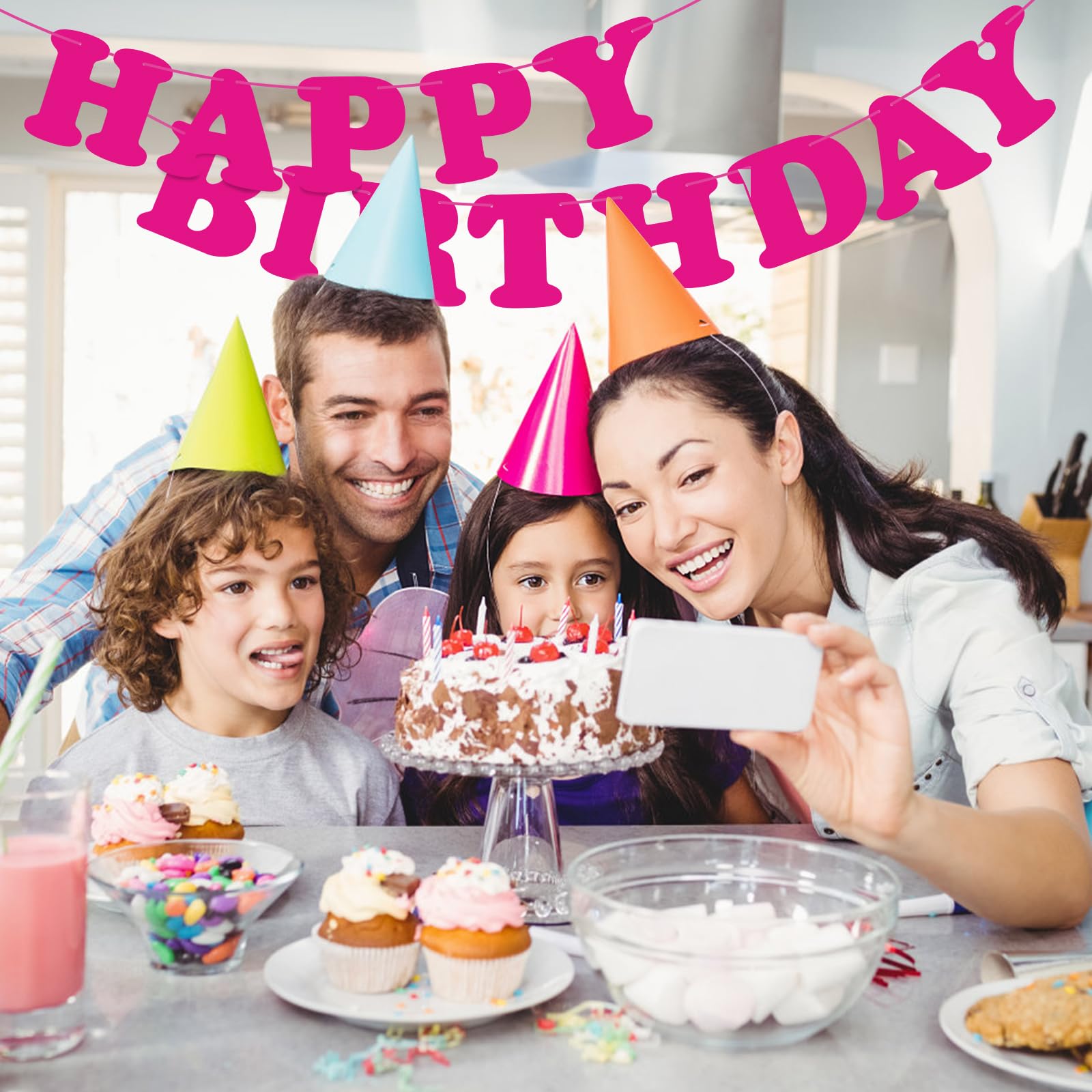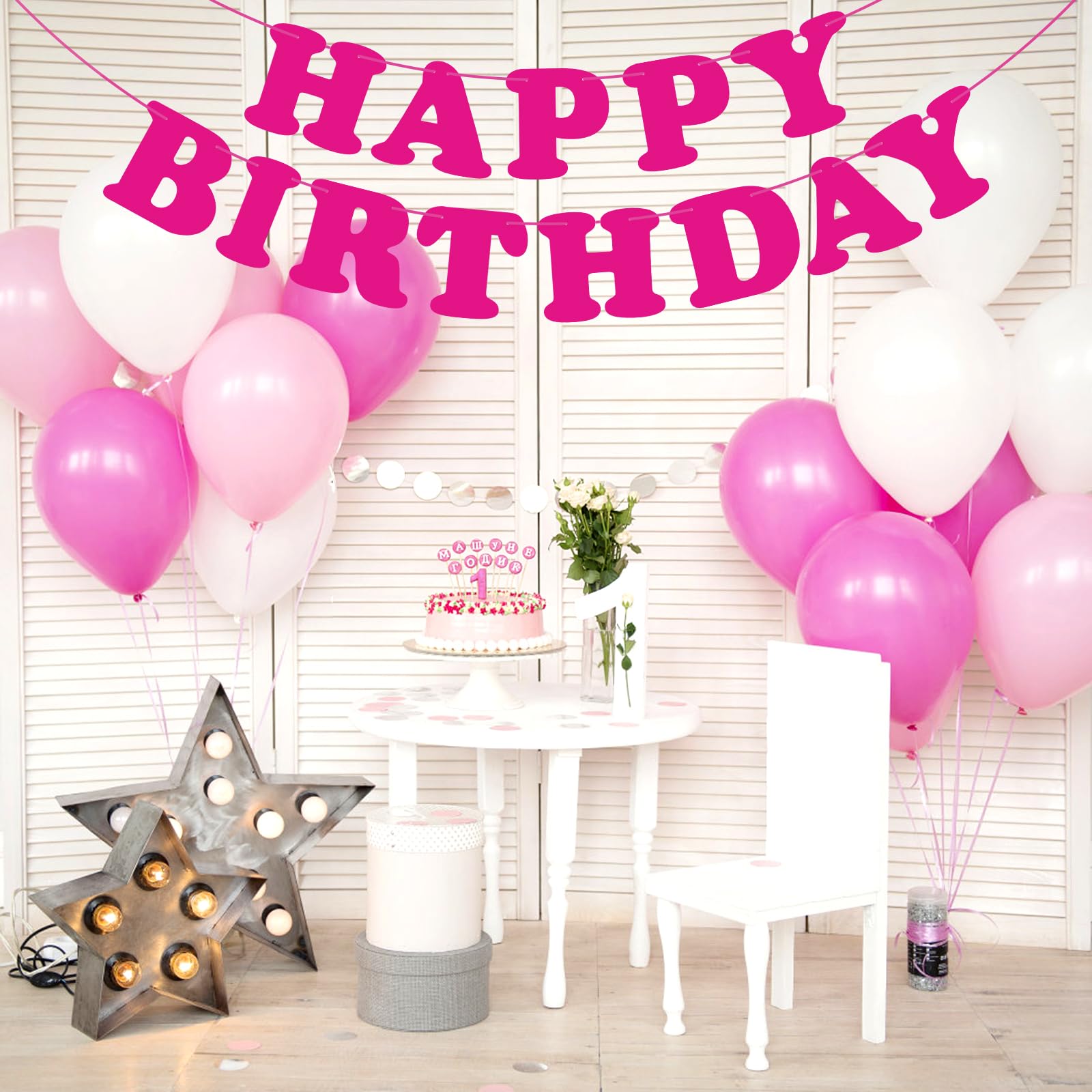 - Q: What is included in the Pink Happy Birthday Banner package? A: The package includes 13 paper flags that spell out 'HAPPY BIRTHDAY' on two satin strings, measuring 8.3 feet and 6.7 feet long.