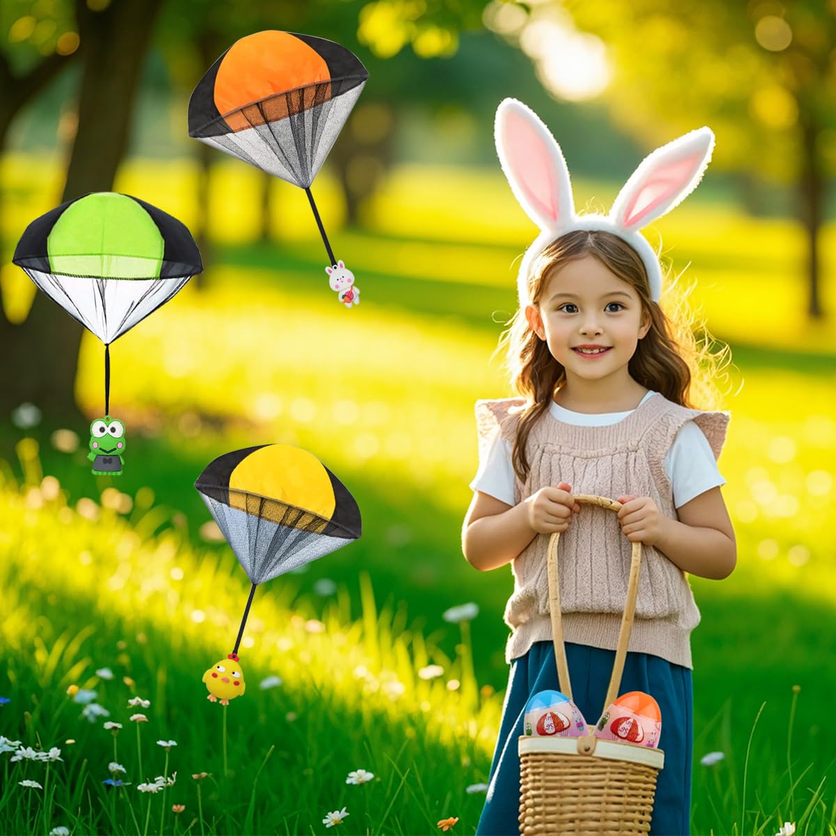 Pinkiwine 6 Pack Easter Eggs with Easter Parachute Toys Features: 1. The Easter Eggs with Easter Parachute Toys are perfect for kids boys girls easter basket stuffers easter basket fillers easter gifts easter toys party favors 2. You will get 6 style Easter figure parachute toys they are designed as chick bunny duck frog all in Easter theme have a fun and Happy Easter 3. Before play it you need to string the figure to the parachute it 's very easy. The smaller you roll it the higher you throw the longer it will fall in the sky 4. Made of well-made environmental nylon it 's safe non-toxic for kids to play just feel free Specifications: Styles: Easter Materials: Nylon Egg Size: about 2.2 x 2.8 (5.6x7.2cm)