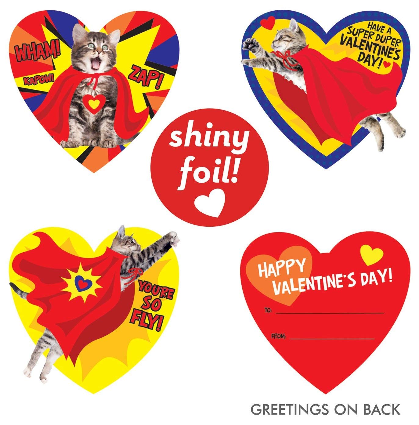- Q: What makes the Super Kitty Valentine cards unique? A: The Super Kitty Valentine cards stand out due to their vibrant imagery, shiny foil accents, and ample space on the back for kids to write personalized messages to their classmates.