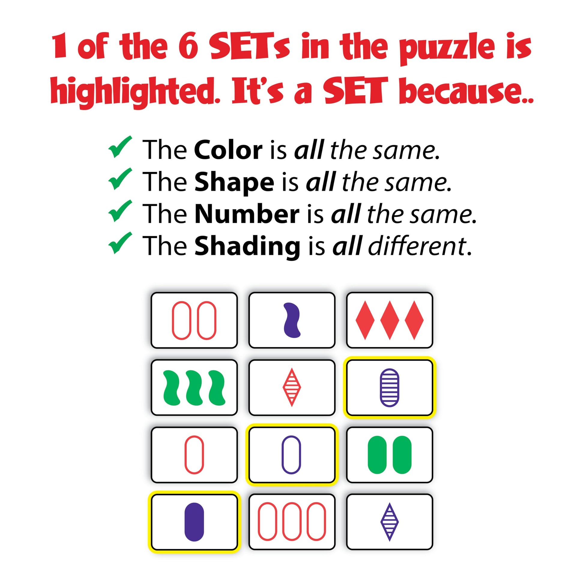 Enjoy a collectible travel case version of the award-winning game that challenges players to race to find as many SETs as they can! A SET is three cards where each individual feature (color, shape, number and shading) is either all the same OR all different! The first player to see a SET calls out ?ETand grabs the cards-there are no ?urnsand no luck here! And not only is it fast-paced fun, it also builds skills and exercises the brain! Because it has a rule of logic, and because players must apply this rule to the spatial array of patterns all at once, they must use both left brain and right brain thought processes! At the end of the game, the player with the most SETs wins! SET is perfect for a wide age range and number of players (including solo play!), and is a fun intergenerational game as well.