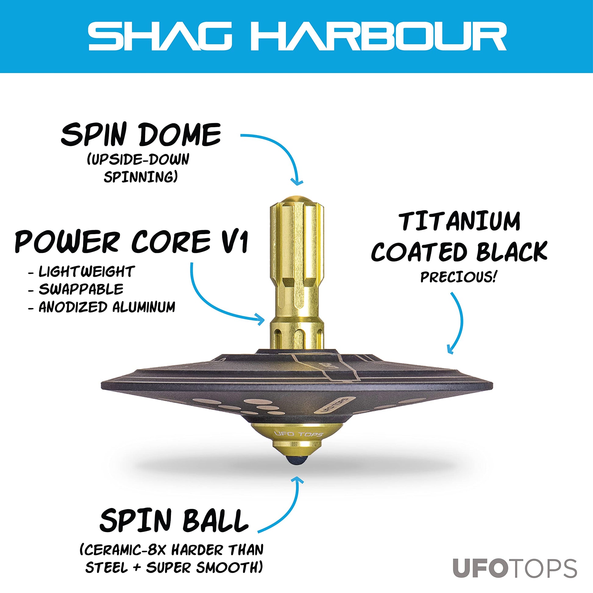 The Shag Harbour UFO Top is a metal spinning top inspired by the 1967 Shag Harbour, Nova Scotia UFO sighting event. Shag Harbour consists of a Black Titanium UFO body and Solar Yellow aluminum Power Core. Shag Harbour is one of three in the Triangulum Series and launched on Kickstarter in the summer of 2021.