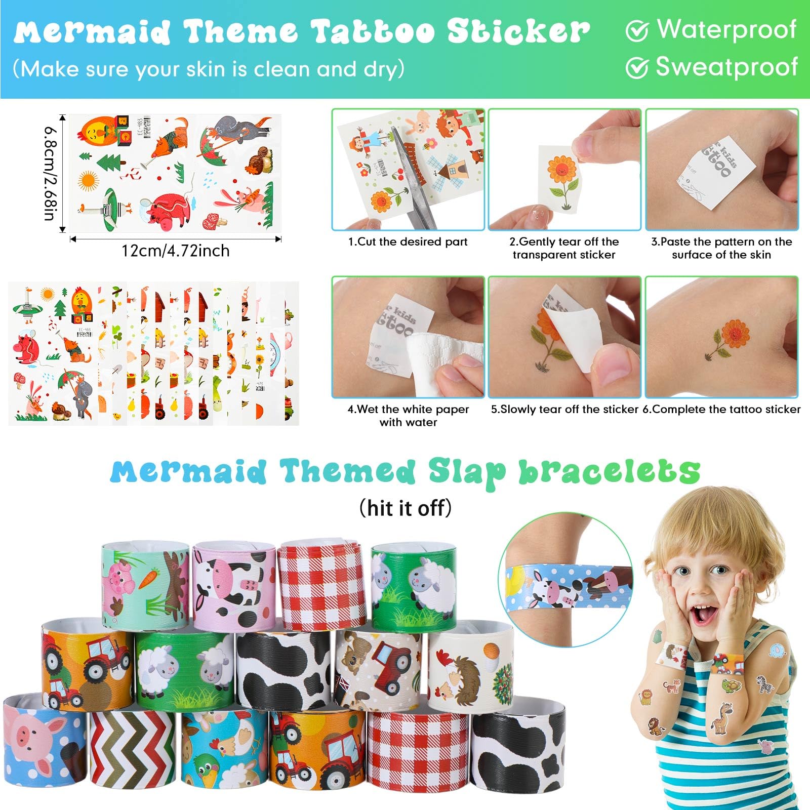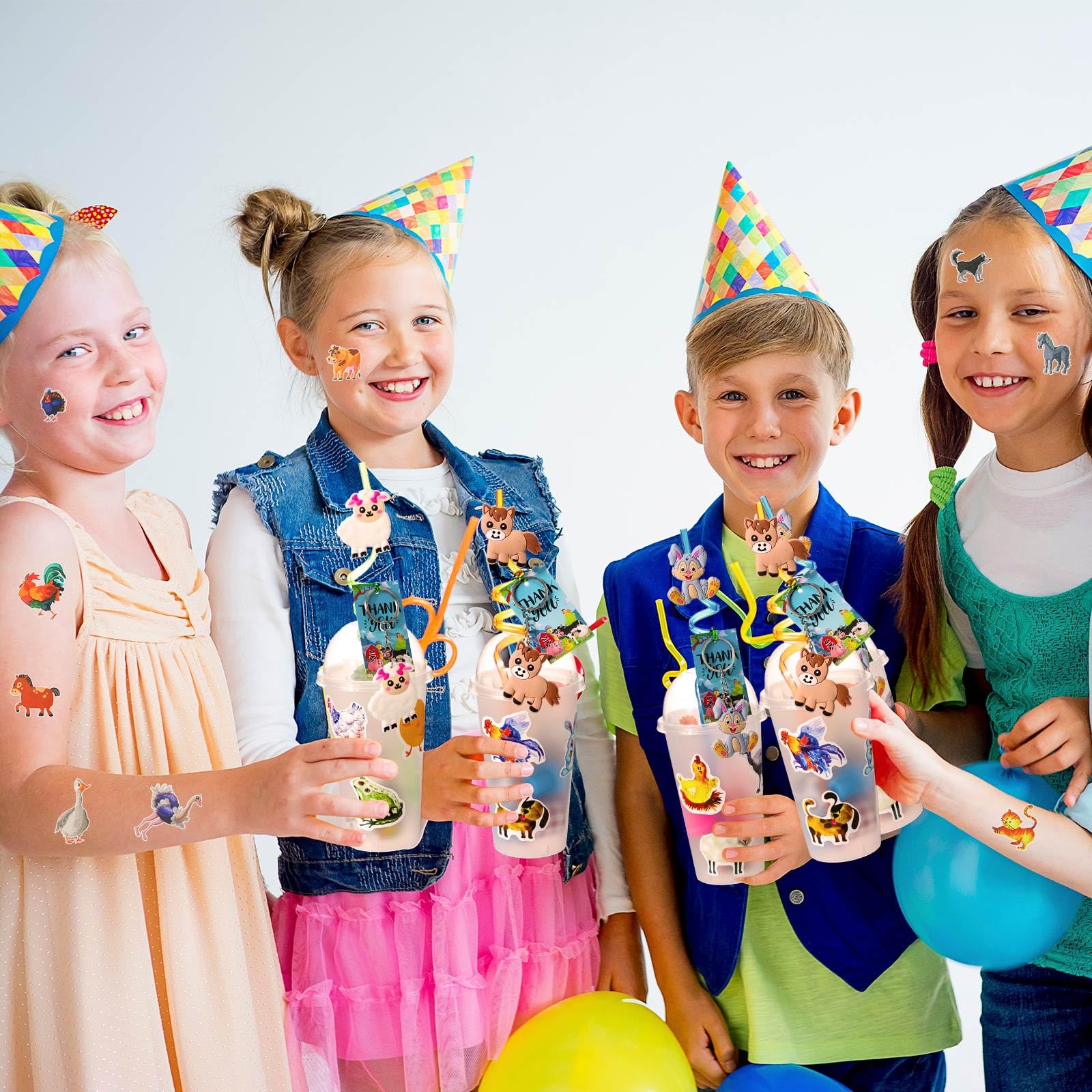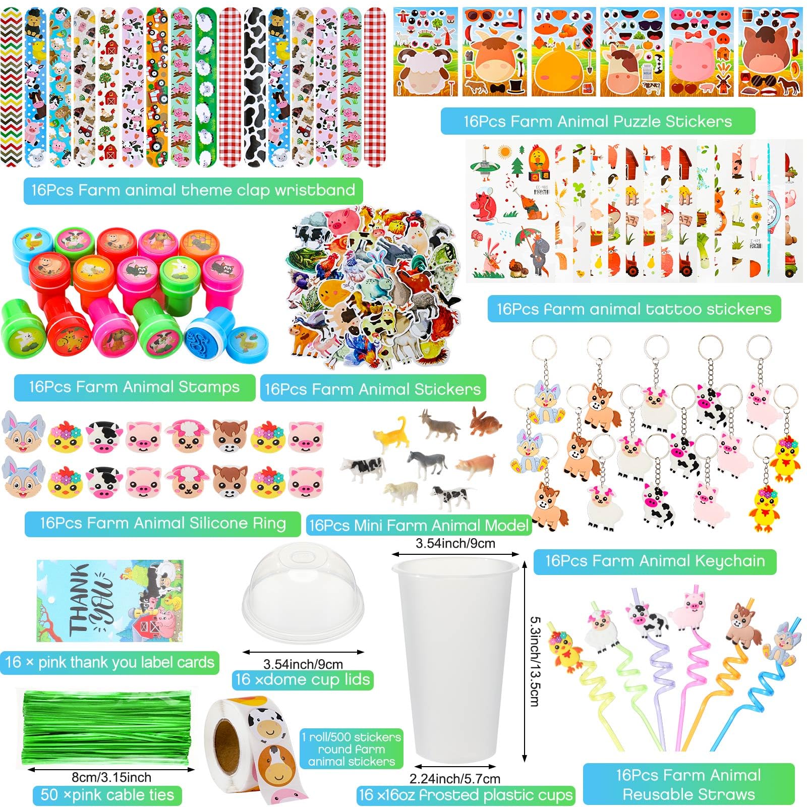 Features: Wide range of uses: The barnyard birthday party supplies in this package are not just for party use. They can also be applied for highlighting a farming theme in a classroom, for costume parties, or as props at carnivals or photo booths. Enhances creativity and learning: While bringing happiness, our farm themed party favors also serve as a fun, visual and interactive way to educate children about different farm animals and their habitats. Specifications: Material: Clap bracelet: PVC Animal images of the rings, keychains, and straws: silicone Straws: plasticCards: kraft paperCups: PPStickers: PVCColor and size: as the pictures shown Package includes: 212 x Farm animal party decorationsNotes: Manual measurement, please allow slight errors on size. The color may exist a slight difference due to different screen displays. Little ones should use our product under the supervision of adults. Small items are included, please keep them away from little ones in case of choking risk. Please keep it away from people under 12 years old.
