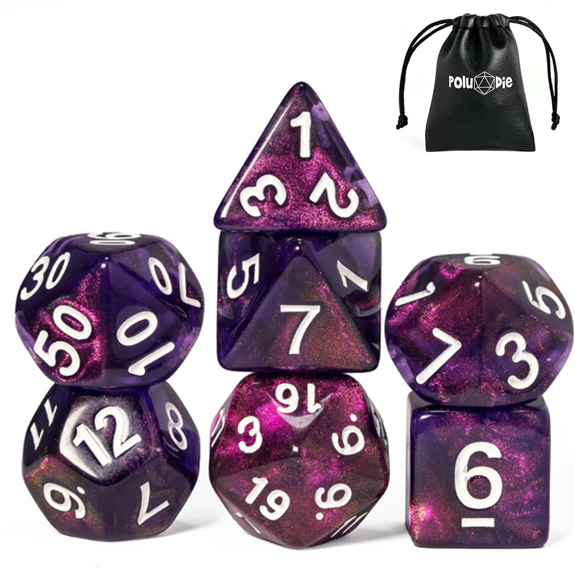 7-Die DND Dice: This full dice set includes 1*D4, 1*D6, 1*D8, 1*D10(0-9), 1*D12, 1*D20 and 1*D%(00-90) totally 7 Pieces. You will get a leather drawstring dice bag to storage it. | Beautiful Colors: With translucent purple and sparkly glitter, the d&d dice Looks so vivid and mysterious. A Great Gift for a Friend/Father/Siblings, Fellow Player, or Dungeon Master. | Easy to Read: Made from high-quality acrylic material with precisely carved mold, these polyhedral dice are extremely durable and easy to roll. Each die with white numbers are easy to read. Number 6's and 9's are clearly marked, no visual trouble. | Widely Used: This dice are perfect for role-playing games, card games, board games, table game, dungeon and dragon, MTG, Shadow Run, Pathfinder, Heroscape, Savage World, Yahtzee, math learning and most intelligence development games. Great game supplies for party, camping, class and most occasions. | 100% SATISFACTION GUARANTEED: Your satisfaction is prior importance to us. Just email us to get an immediate solution for any defective or incomplete set.