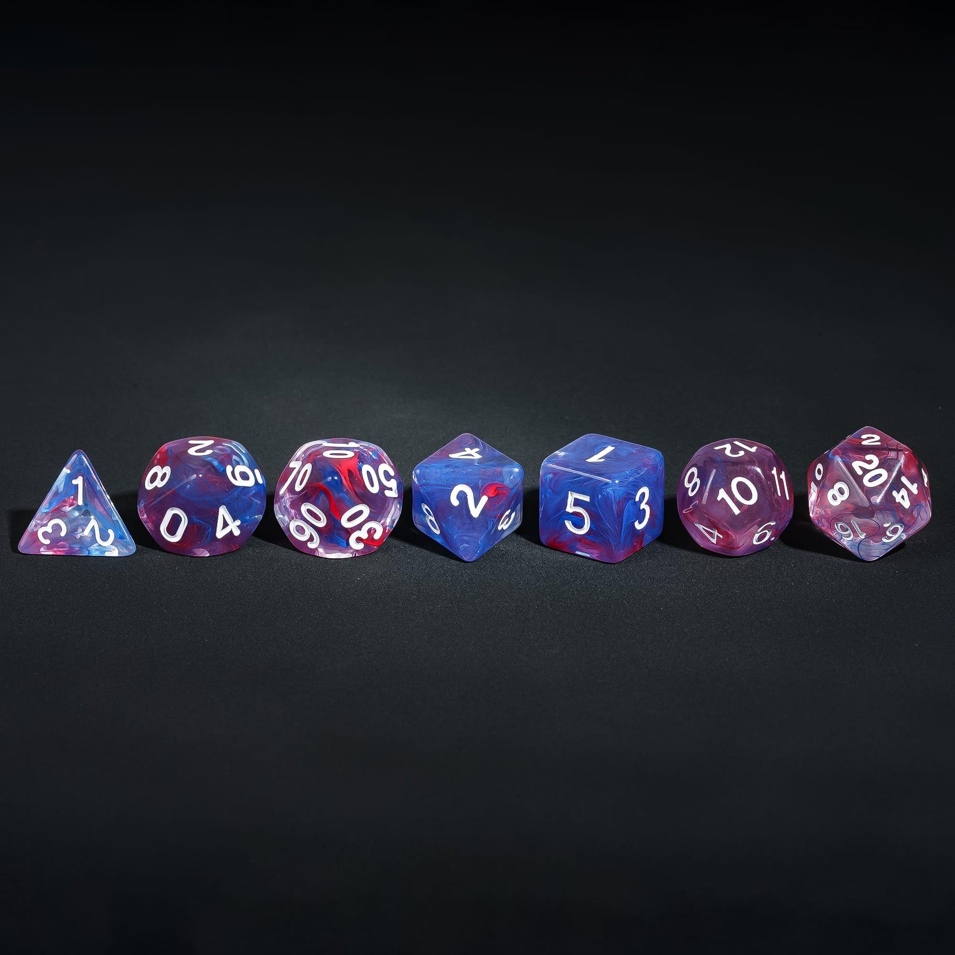 7-Die DND Dice: This full dice set including 1*D4, 1*D6, 1*D8, 1*D10(0-9), 1*D12, 1*D20 and 1*D%(00-90) totally 7 Pieces. You will get a leather drawstring dice bag to storage it. Beautiful Color: Translucent Blue Mix Red, makes the d&d dice Looks vivid and dream. A Great Gift for a Friend/Father/Siblings, Fellow Player, or Dungeon Master. Easy to Read: Made from high-quality acrylic material with precisely carved mold, these polyhedral dice are extremely durable and easy to roll. Each die with white number are easy to read. Number 6's and 9's are clearly marked, no visual trouble. Widely Used: This dice are perfect for role-playing games, card games, board games, table game, dungeon and dragon, Pathfinder, Heroscape, Savage World, Yahtzee, math learning and most intelligence development games. Great game supplies for party, camping, class and most occasions. 100% SATISFACTION GUARANTEED: Your satisfaction is prior importance to us. Just email us to get an immediate solution for any defective or incomplete set.