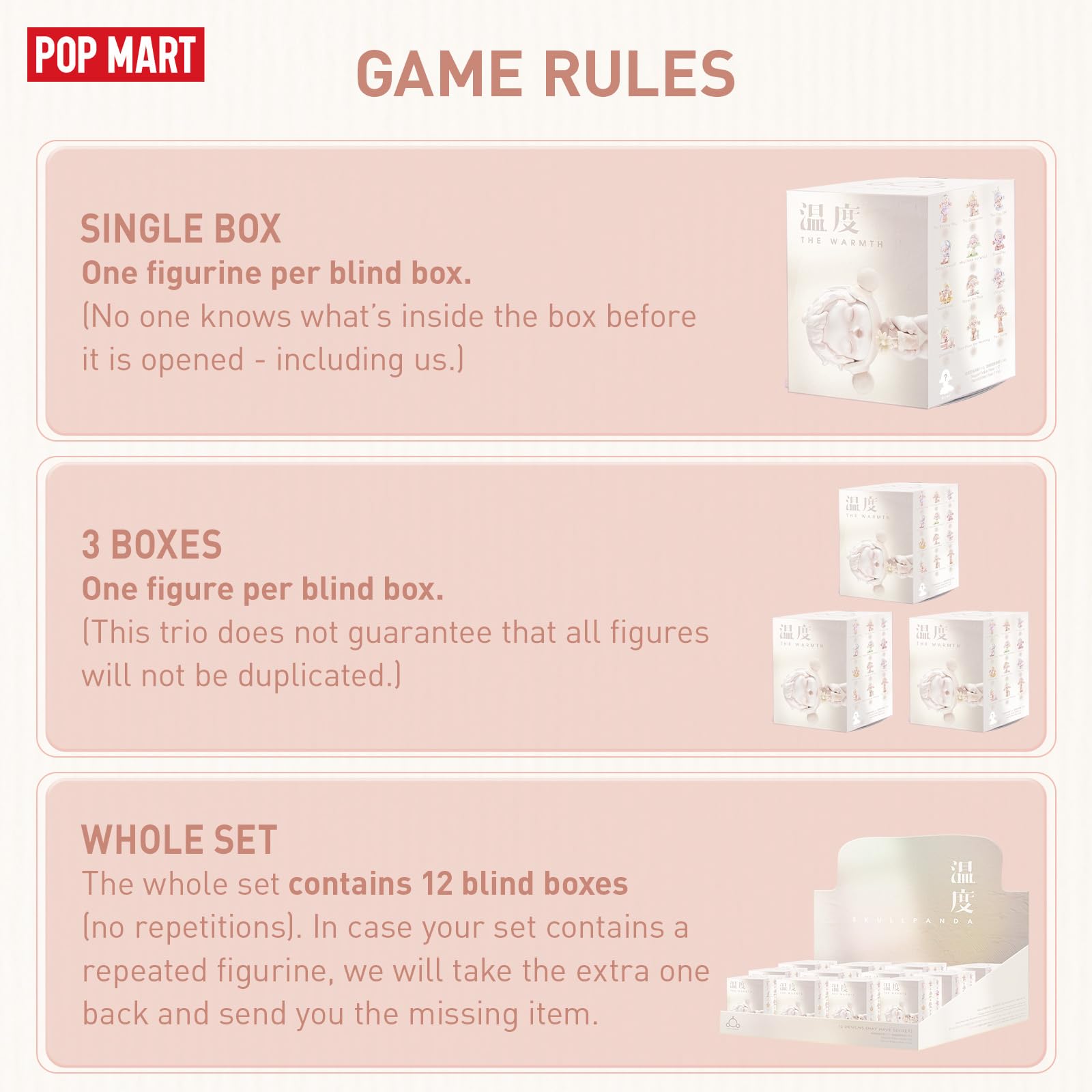 - Q: How many figures are included in the POP MART SKULLPANDA Warmth Series? A: This set includes twelve collectible action figures. It offers a variety of designs perfect for display or gifting.