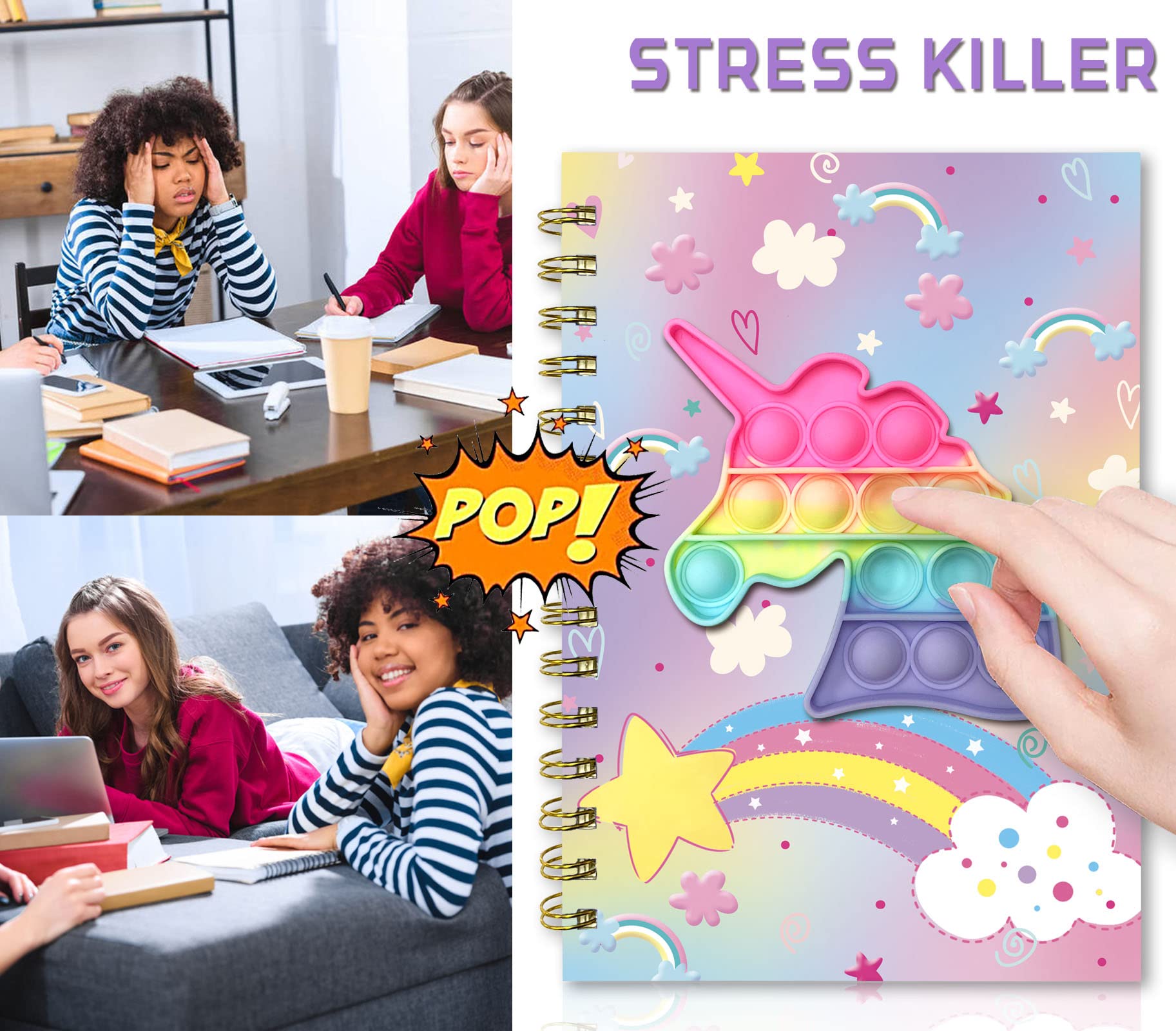 ?Notebook For Kids?- This Pop Notebook It Is 8.3 X 5.7 Inches, 160 Lined Pages In Premium Thick Ivory White Paper. This Journal Combines Pop Fidget Toy And Notebooks Together, Children Have Fun When Feel Boring And Tired Studying | ?Cute Spiral Notebook?- Hardcover Girls Journal Is Binding With Twin-Wire Spiral, It Makes The Notebook Can Be Lay Flat, Comes With One 6-Multicolored Ballpoint Pen As A Set, It