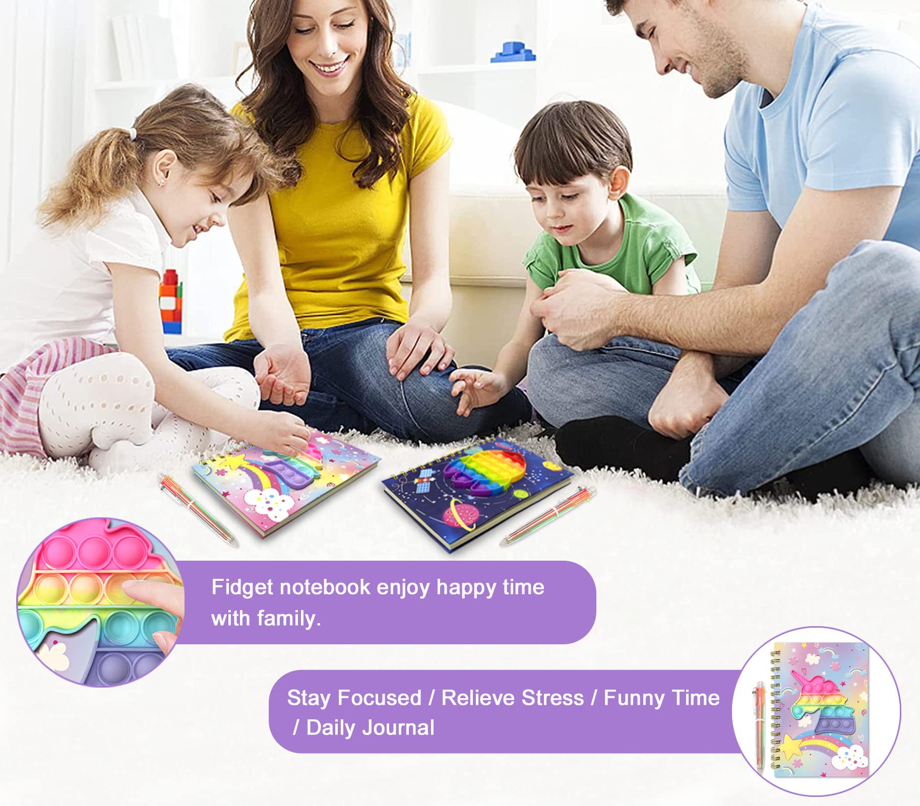 - Q: How does the pop fidget feature work in this notebook? A: The Pop Notebook combines a traditional journal with a pop fidget toy, enabling kids to press the bubbles on the cover for sensory fun, helping them relax and alleviate boredom during study sessions.