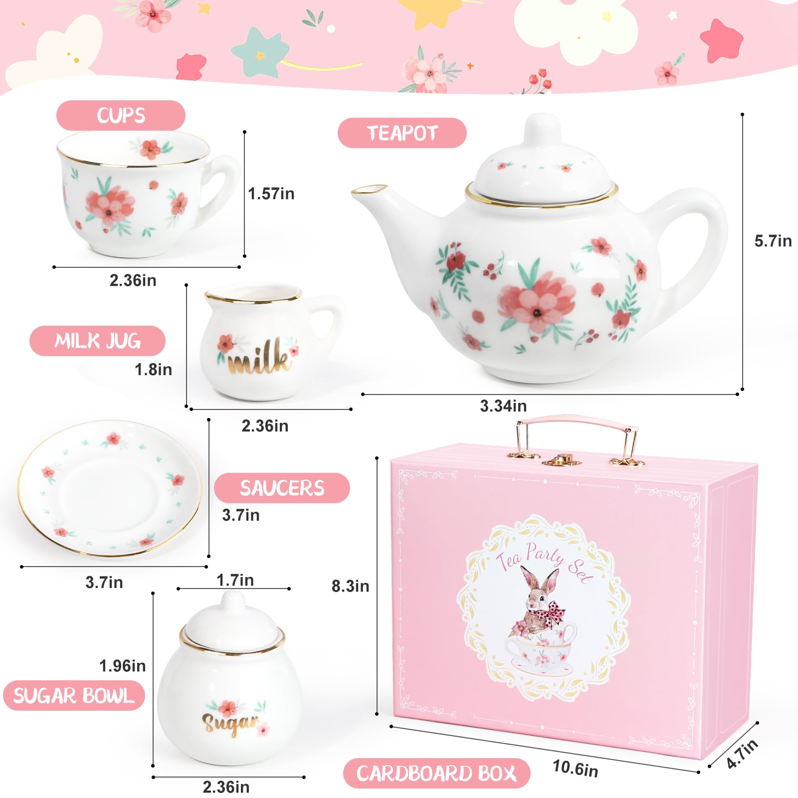 Porcelain Tea Set for Girls, Tea Party Set for Little Girls, Kids Tea Set Kitchen Pretend Play, Princess Tea Time Playset with T