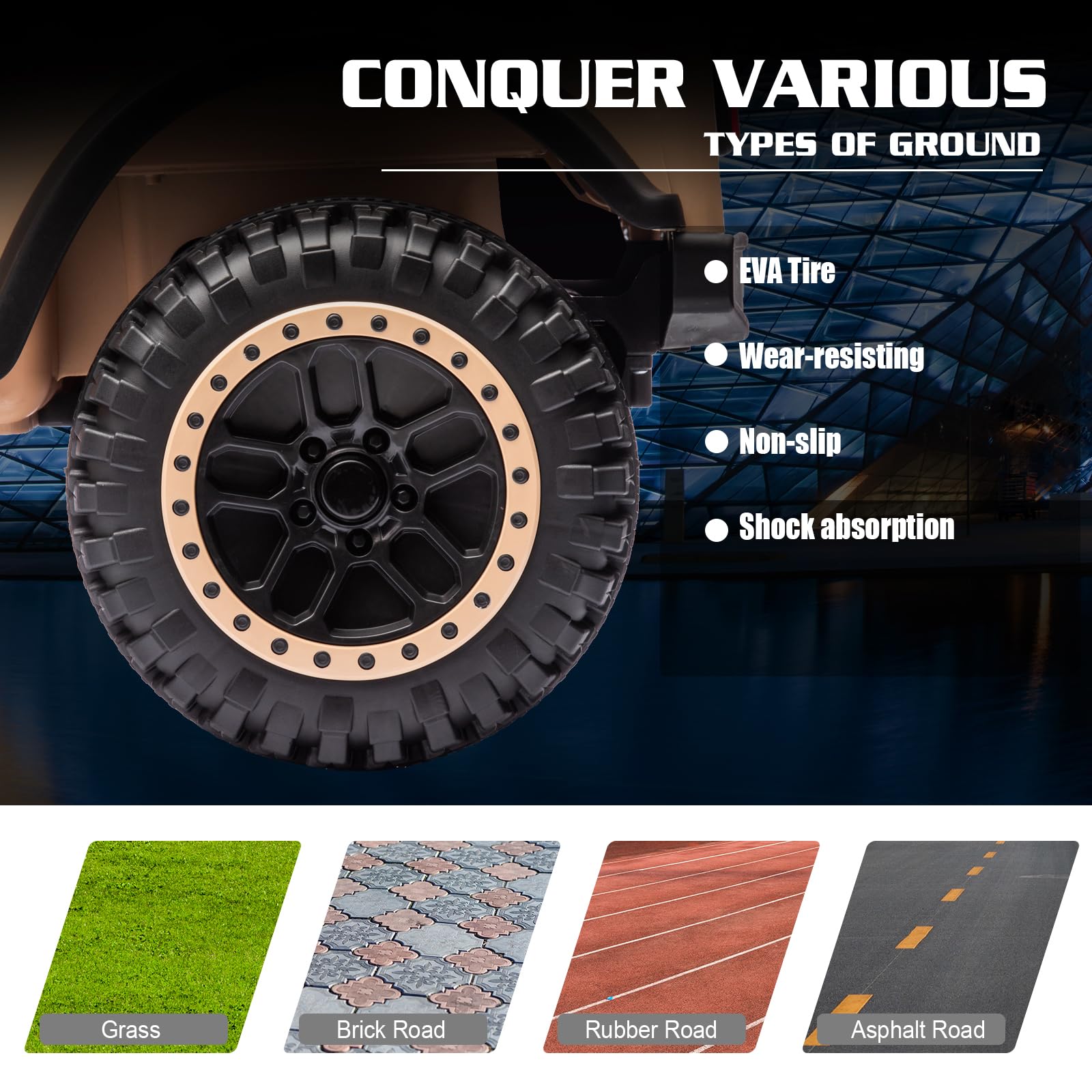 Realistic Off Road UTV Design: POSTACK kids ride on truck has a 24V battery, 4 powerful drive motors, bright LED lights, horn & engine sounds, adjustable seat belt, lockable doors, foot pedal acceleration, wear-resistant wheels and cool decoration for off-road style, which can attract your kids at first sight. Kids will enjoy driving outside and get a fantastic driving experience. | High-Performance Ride on Car: When the ride on car starts, the soft start system will work to avoid the risk of sudden cceleration or braking. The 4 wear-resistant anti-skid non-plastic wheels with spring suspension can provide a smooth driving on different terrains such as grass, brick road, asphalt and so on. Dimension: 39.7in*25.5in*24in (101*65*61cm), load capacity: 66lbs. Speed: 1.9-3.7mph | Manual Driving & Remote Control: Your kids can manually drive this POSTACK ride on UTV by steering wheel and pedal to enjoy an independent off-road adventure! If your kid is too young to drive, the 2.4GHz parent remote control mode allow you to control the car to avoid potential dangers. Remote mode overrides the manual driving mode, which can improve the safety of your little ones during driving. | Music Function for Infinite Fun: POSTACK power ride-on wheel truck provides your children with extra fun through its built-in music, MP3 player, AUX input, USB port, and the Bluetooth function allows your kids to enjoy their favorite songs during driving. The high/low speed function allow your kid to choose their preferable mode. | Ideal Gift for Children: POSTACK kids ride on toy truck is made of safe PP material and equipped with multiple functions that can enrich your little one? life and enhance parent-child relationship. Certificated with ASTM and CPSIA, it can be a surprising Christmas gift or birthday gift for your children or grandchildren.