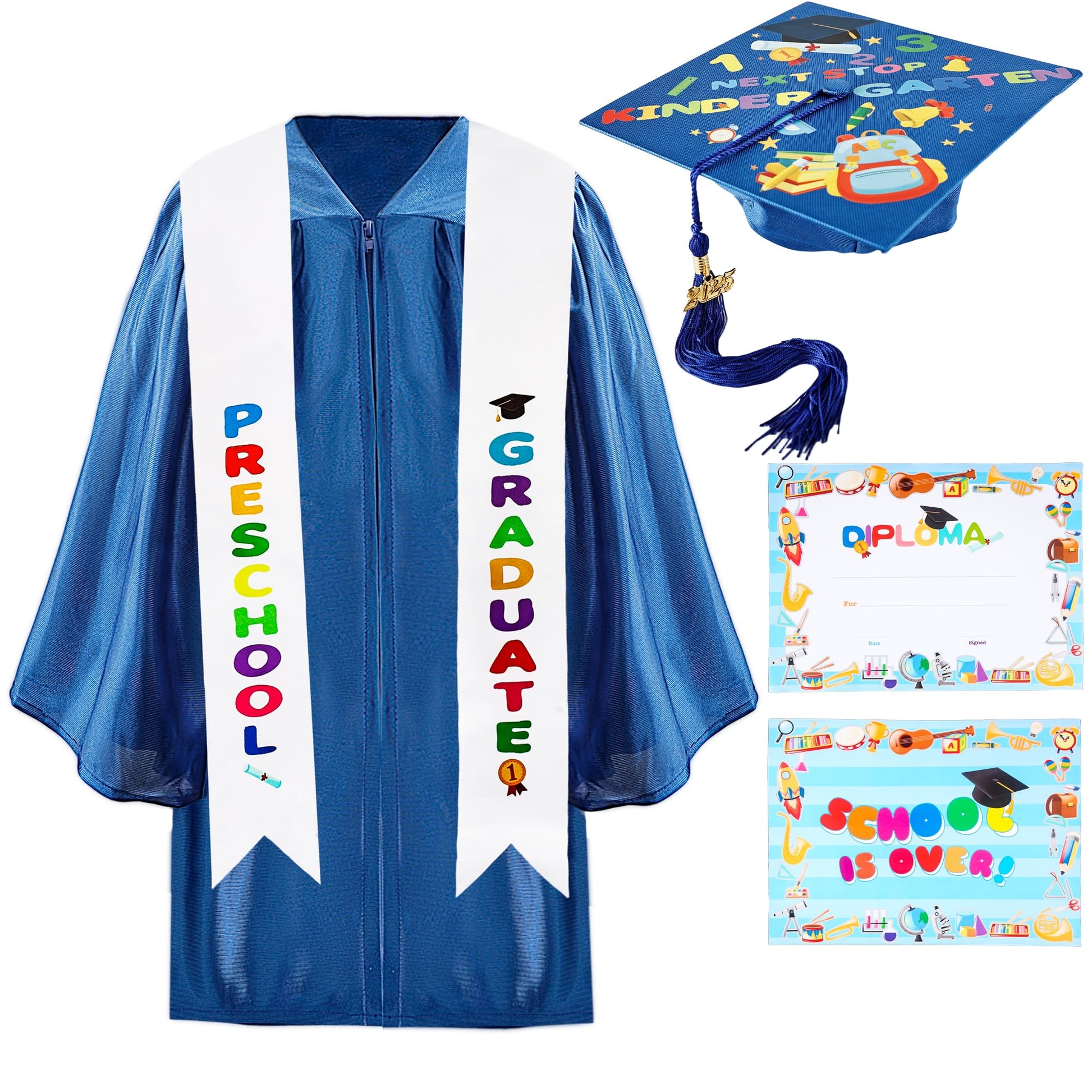 Preschool Graduation Gown And Cap With Tassel Printed Graduation Stoles Certificate Shiny Graduation Gown For Kindergarten (Blue