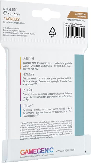 View comparePrime Board Game Sleeves | Pack of 80 Extra-Clear Sleeves | 67 by 103 mm Card Sleeves Optimized for Use with 7 Wonders | enhanced Card Protection | FFG Brown Color Code | Made by Gamegenic