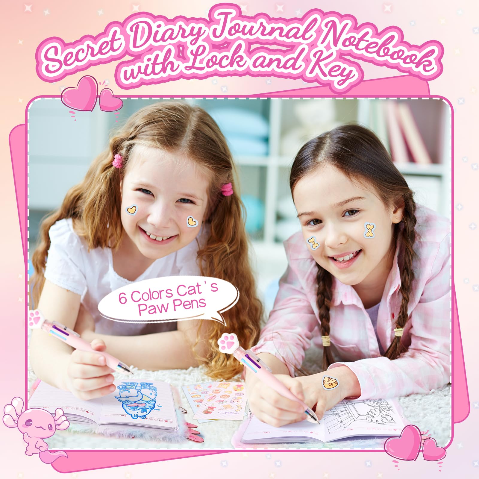 Axolotl Diary for Girls with lock and keys, Kids Journal School Travel Notebook Gift Set for Writing and Drawing,Multicolored Pen, Stickers, Birthday Gift for Girls ages 6-8