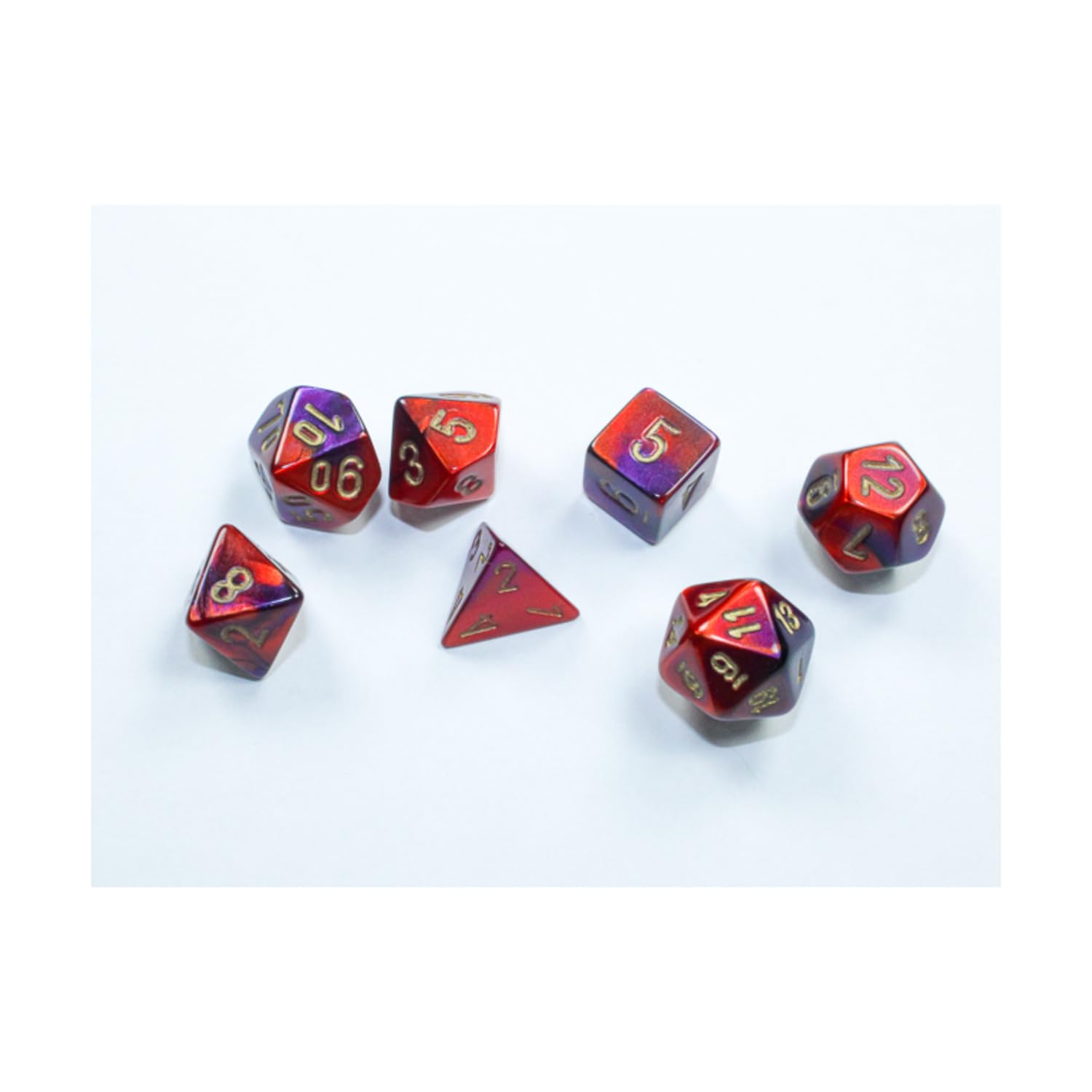Purple And Red Gemini Mini Dice With Gold Colored Numbers 10Mm (3/8In) Set Of 7 Chessex