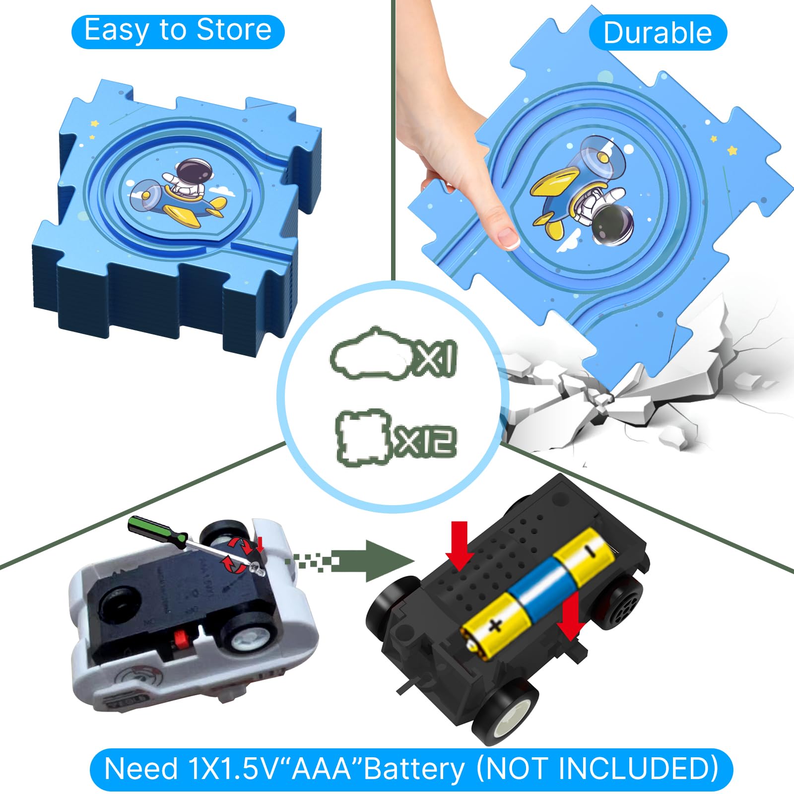 - Q: How does this toy promote learning and skill development? A: This educational toy helps develop logic thinking and problem-solving skills as children assemble the puzzle pieces to create different track configurations for the battery-operated vehicle.