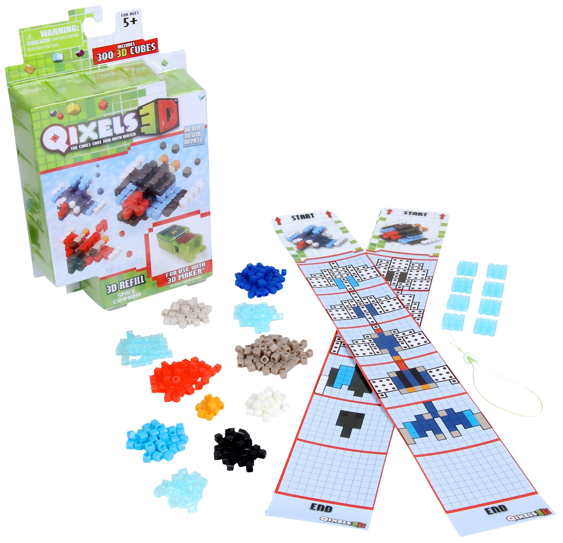 Qixels 3D cubes gives you the power to shape and create Qixels in 3D! Build them up and build them out and start building a 3D Qixel World! Build up your design and brush with water and they magically stick together. When they dry, they stay and youre ready to play! Check out the Space Command Refill Pack: .Build your own 3D fleet of Space Ships. Create fighters, Cruisers and Motherships so you can explore the universe!*3D Maker is sold separately and is required to complete your design.