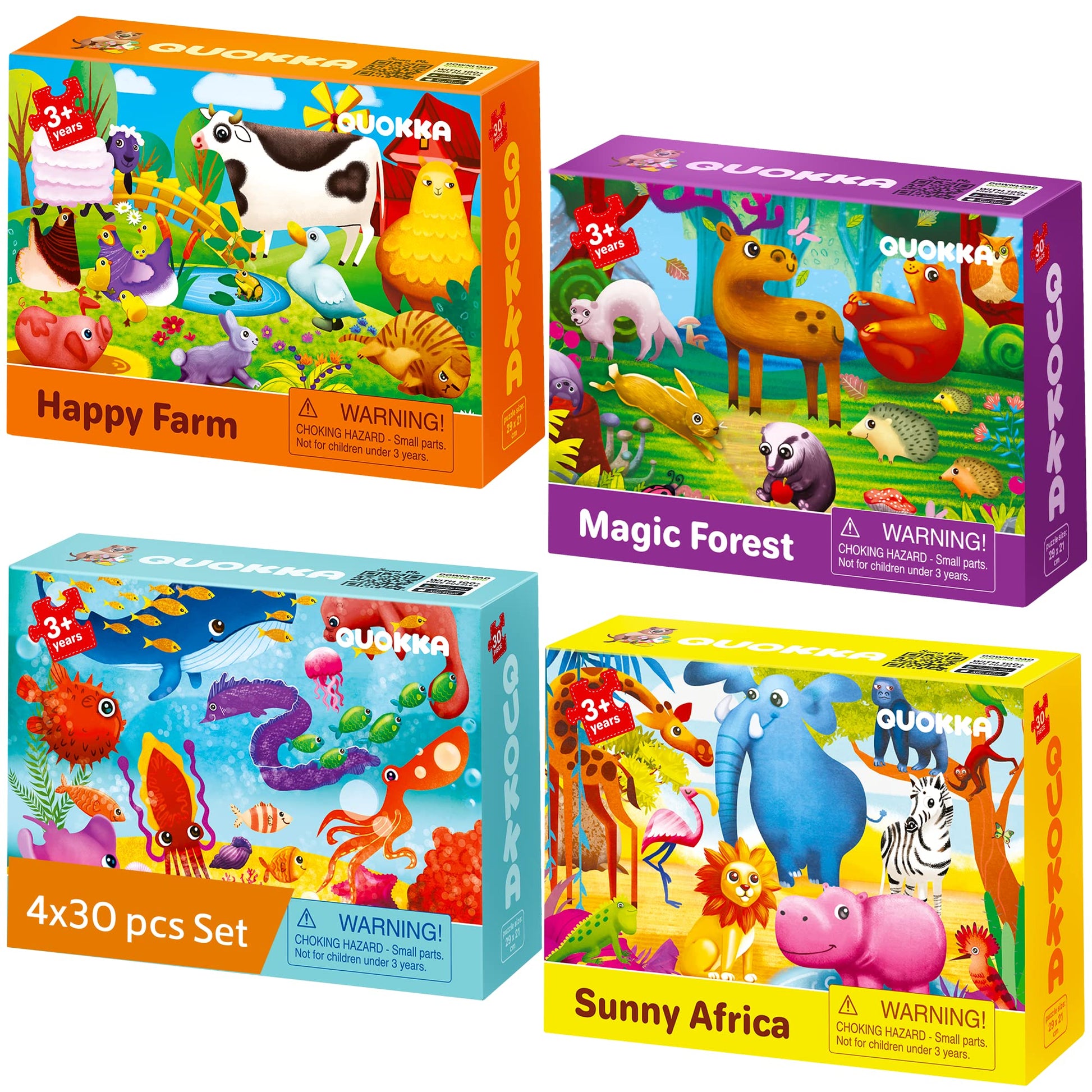 • Q: How many puzzles are included in the QUOKKA Puzzles set? A: The set includes 4 jigsaw puzzles, each containing 30 pieces, providing a total of 120 pieces for imaginative play and learning.