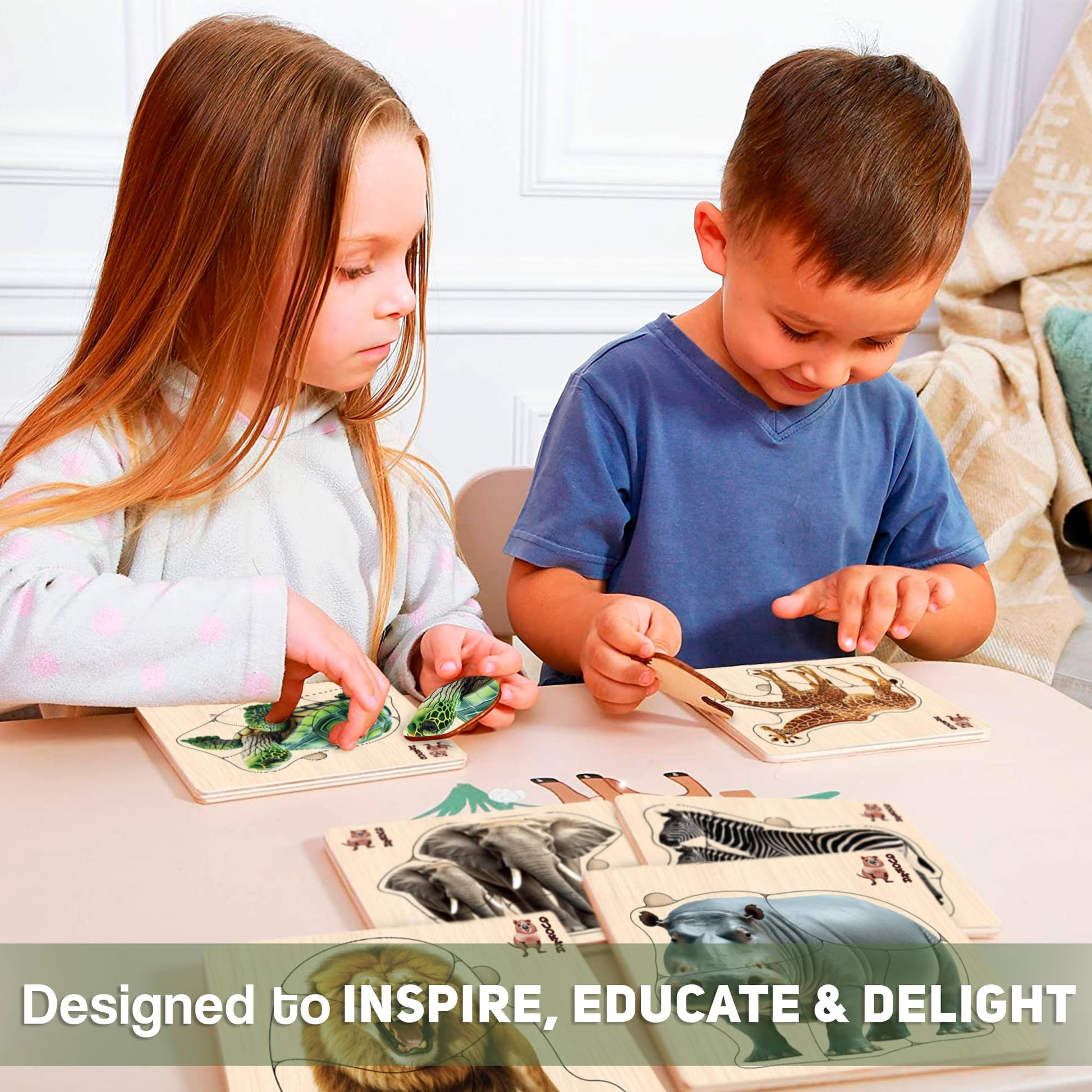 • Q: How do these wooden puzzles promote motor skills in toddlers? A: These puzzles are specifically sized at 15x15 inches, which allows small hands to grip and manipulate them easily. This design helps toddlers develop fine motor skills and dexterity as they learn to fit the pieces together.