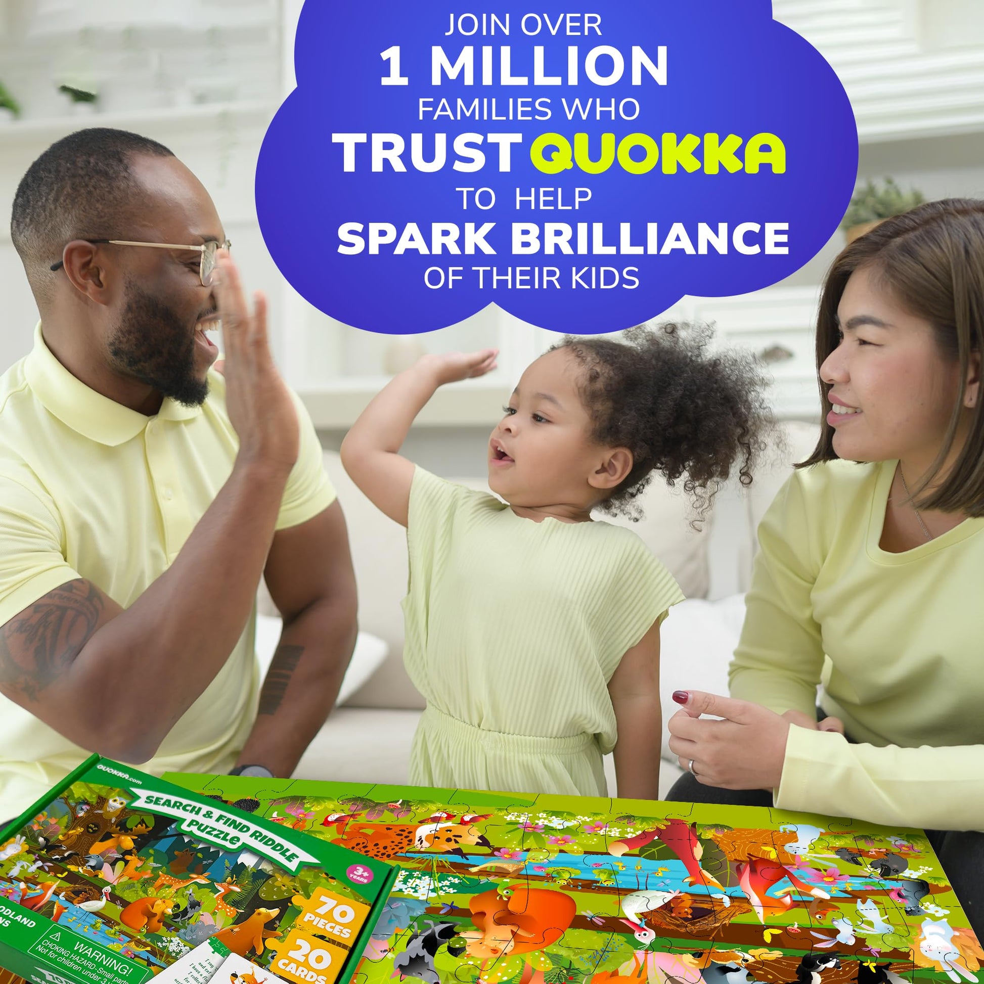• Q: How many puzzle pieces are included in the QUOKKA Search and Find Puzzle set? A: Each set includes 70 high-quality puzzle pieces that create vibrant scenes, providing a challenging yet fun experience for children.