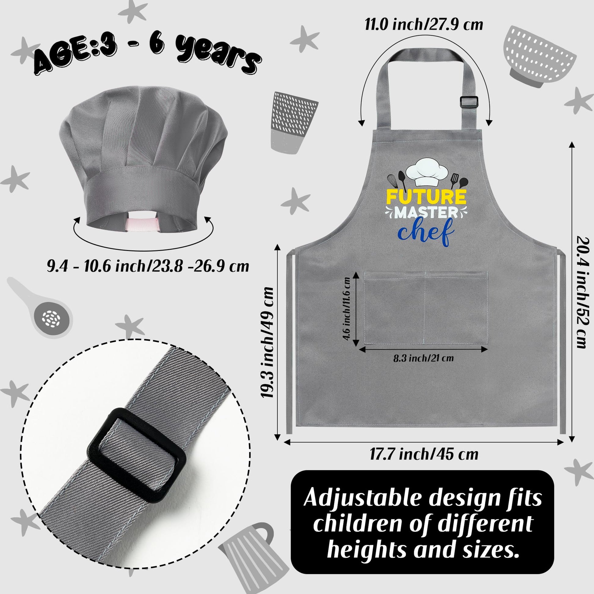 - Q: What features make this apron set a great gift for kids? A: This apron set features a fun 'FUTURE MASTER chef' design and unique cookware patterns that appeal to both boys and girls. It's an excellent gift for birthdays, holidays, or any occasion, promoting creativity and fun in the kitchen.