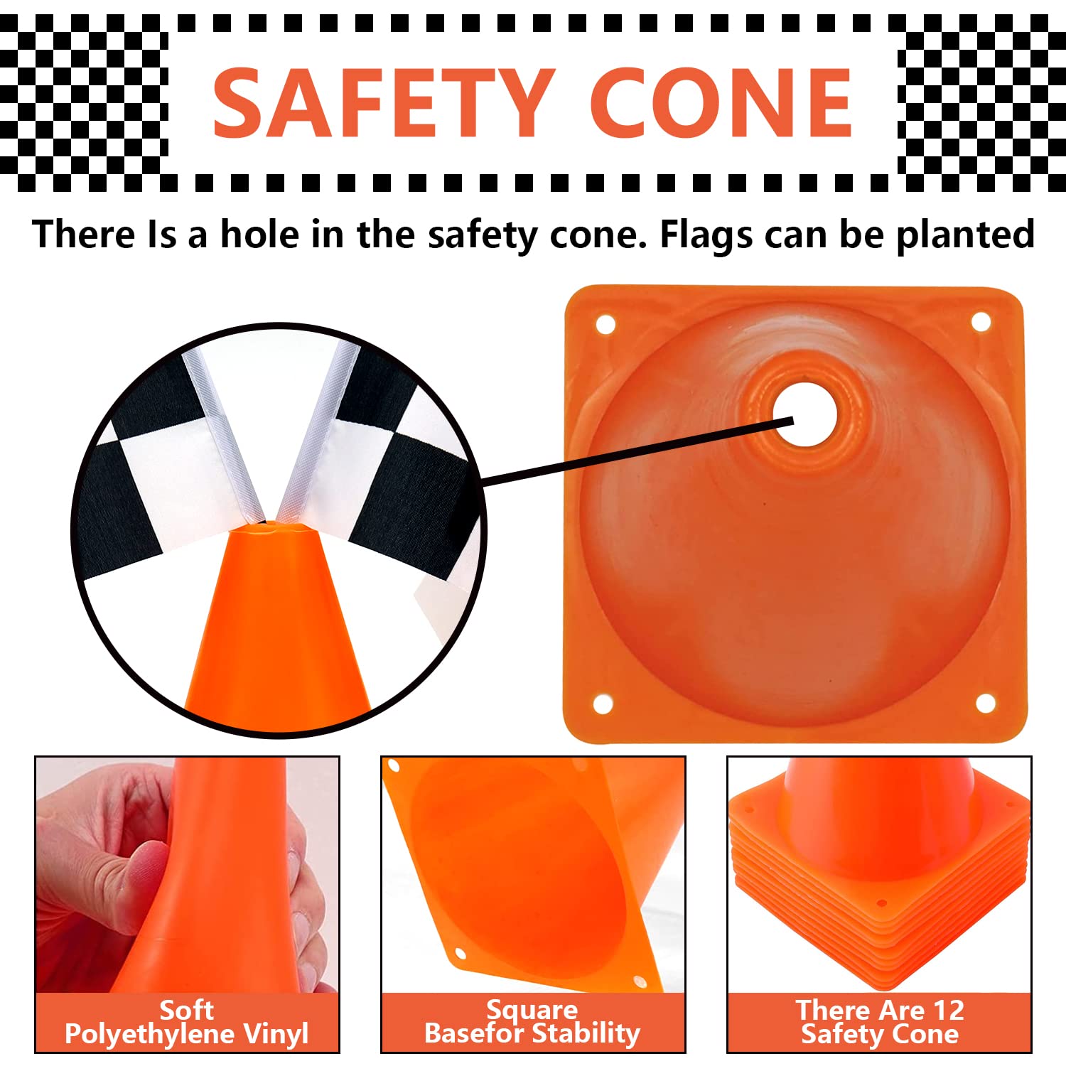Race Car Party Supplies - 12 Traffic Cones With Holes on Top, 24 Checkered Flags, Checkered Race Car Party Tablecloth, Wheel Tir