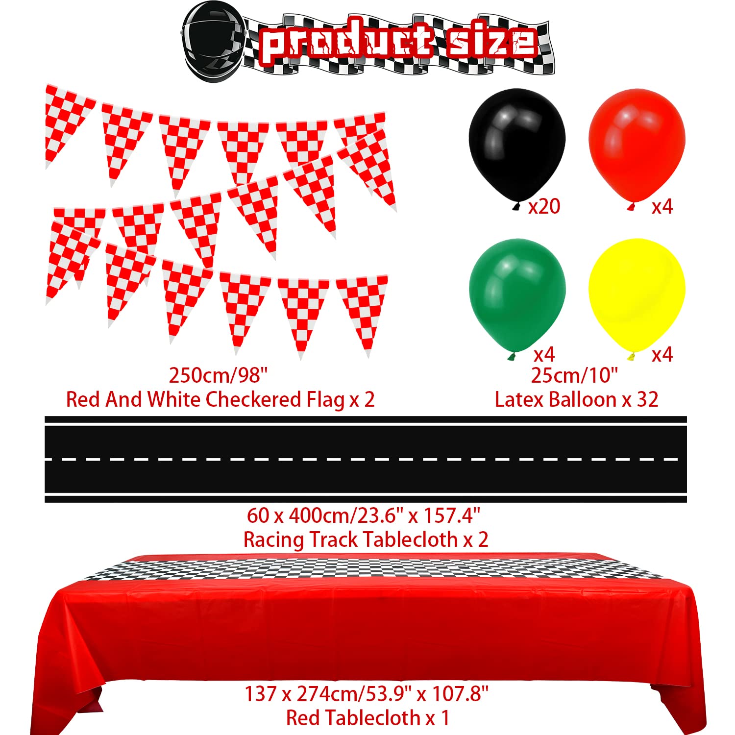 Package includes: 24PCS Checkered Flags 12PCS Traffic Cones With Hole on Top 32PCS Traffic light balloon (green/4PCS, red/4PCS, yellow/4PCS, black/20PCS) 2PCS White and red checkered racing pennant banners 4PCS Wheel tire Balloons 1PC Red black white Race car theme tablecloths 2PCS long racetrack floor running mat 50PCS Checkered black and white flags cake topper 8PC Road tape, curves, car stickers for toy cars