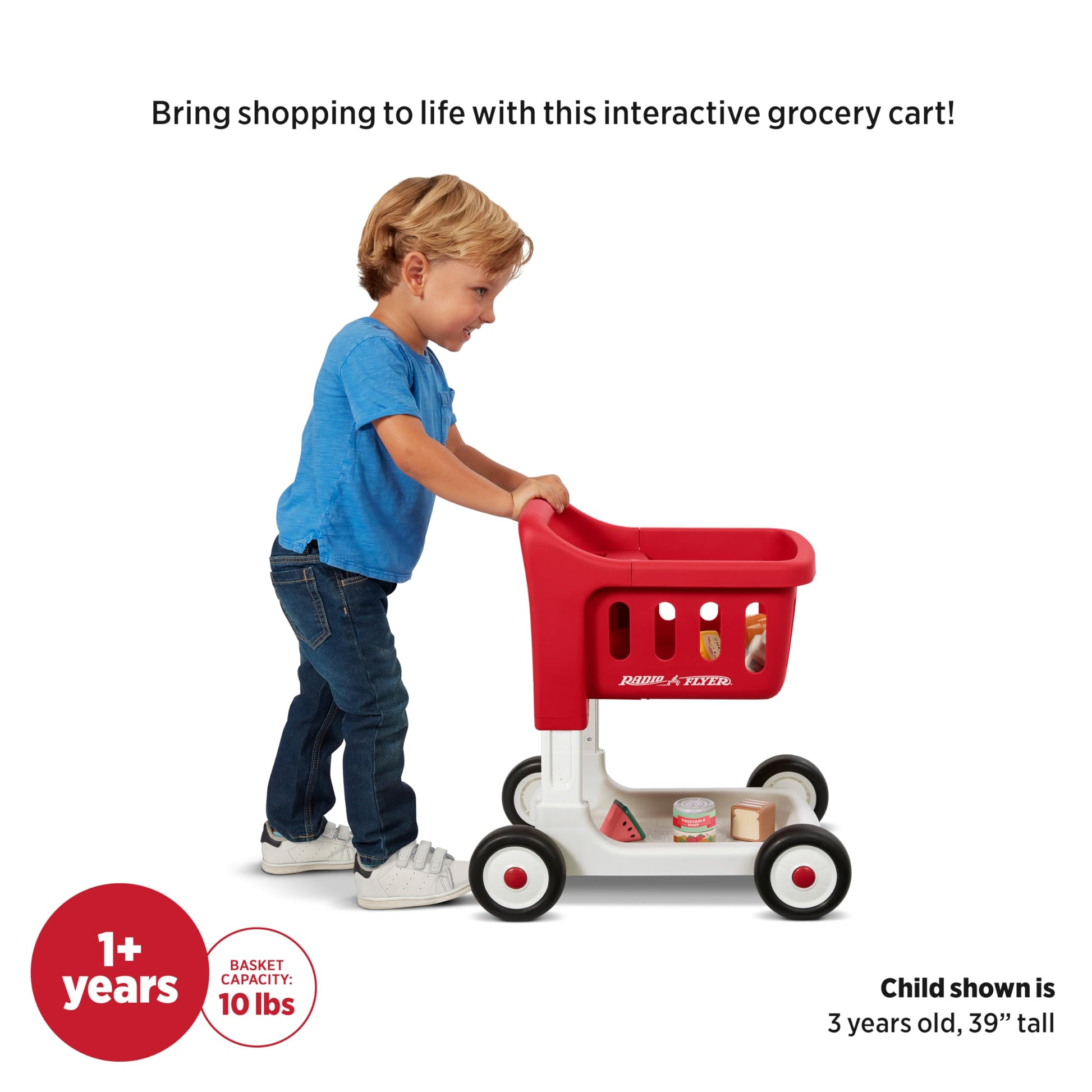 Bring shopping to life with the Scan & Sort Shopping Cart with Lights & Sounds! This shopping cart features Safety Resist Clickers for your little shopper, which provide stability and resistance as the cart is pushed. This shopping cart features 3 adjustable heights and grows with your child, ensuring years of fun! The top of the cart has cut outs for shape sorting, and the 6 included play food items double as shapes to learn with. With an LED light sensor, kids can enjoy scanning their groceries and experience music, lights, and sounds throughout their imaginative shopping experience. The volume for music and sounds is adjustable. 3 AAA batteries are required, batteries included. Shopping cart basket can hold up to 10 lbs. Recommended for 1+ years. For additional questions, support, or concerns, please contact our customer service team at https://www. radioflyer. com/customer-service/ or 1 (800) 621-7613.