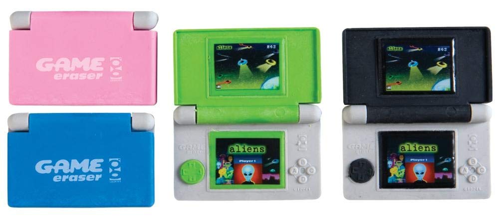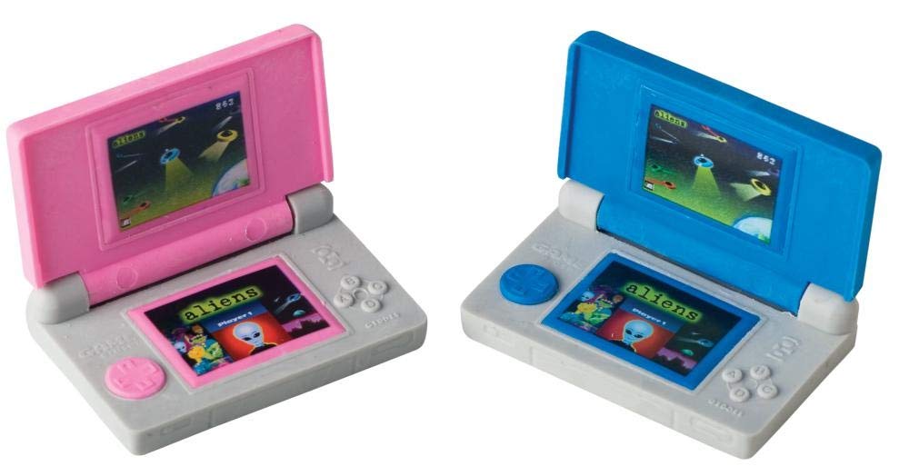This game eraser s hinged top mimics hand held games. Assortment contains pink, black, blue and green erasers. 2 1/4 x 1 1/2 inches and 1/2 inches thick! WARNING: Choking Hazard - Small Parts. Not for Children under 3 years.