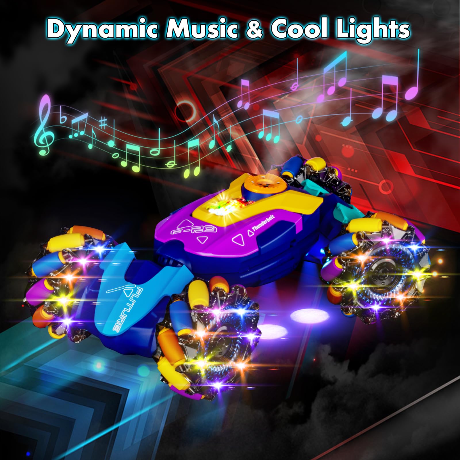 - Q: Does the RC car have any special effects? A: Yes, it features cool lights and music, with full-color lights on the wheels and dynamic sound effects to enhance the stunt performance.