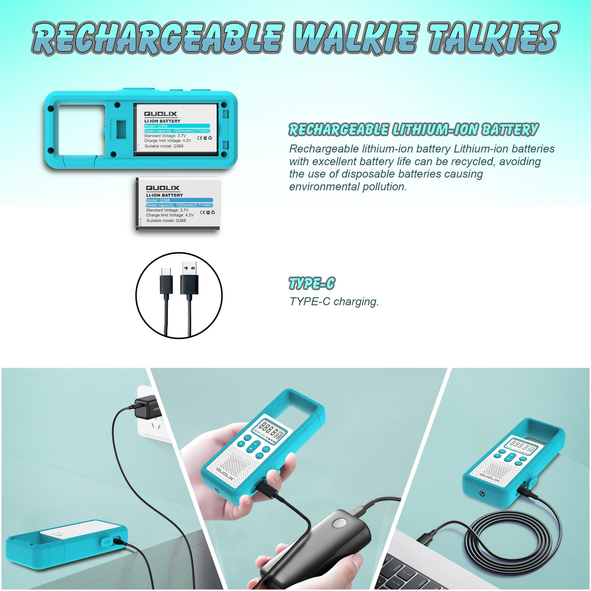 - Q: What is the range of the Quolix rechargeable walkie talkies? A: The Quolix rechargeable walkie talkies can communicate up to 0.8-1.2 miles in urban settings and up to 3 miles in open areas, making them ideal for outdoor activities such as hiking and camping.