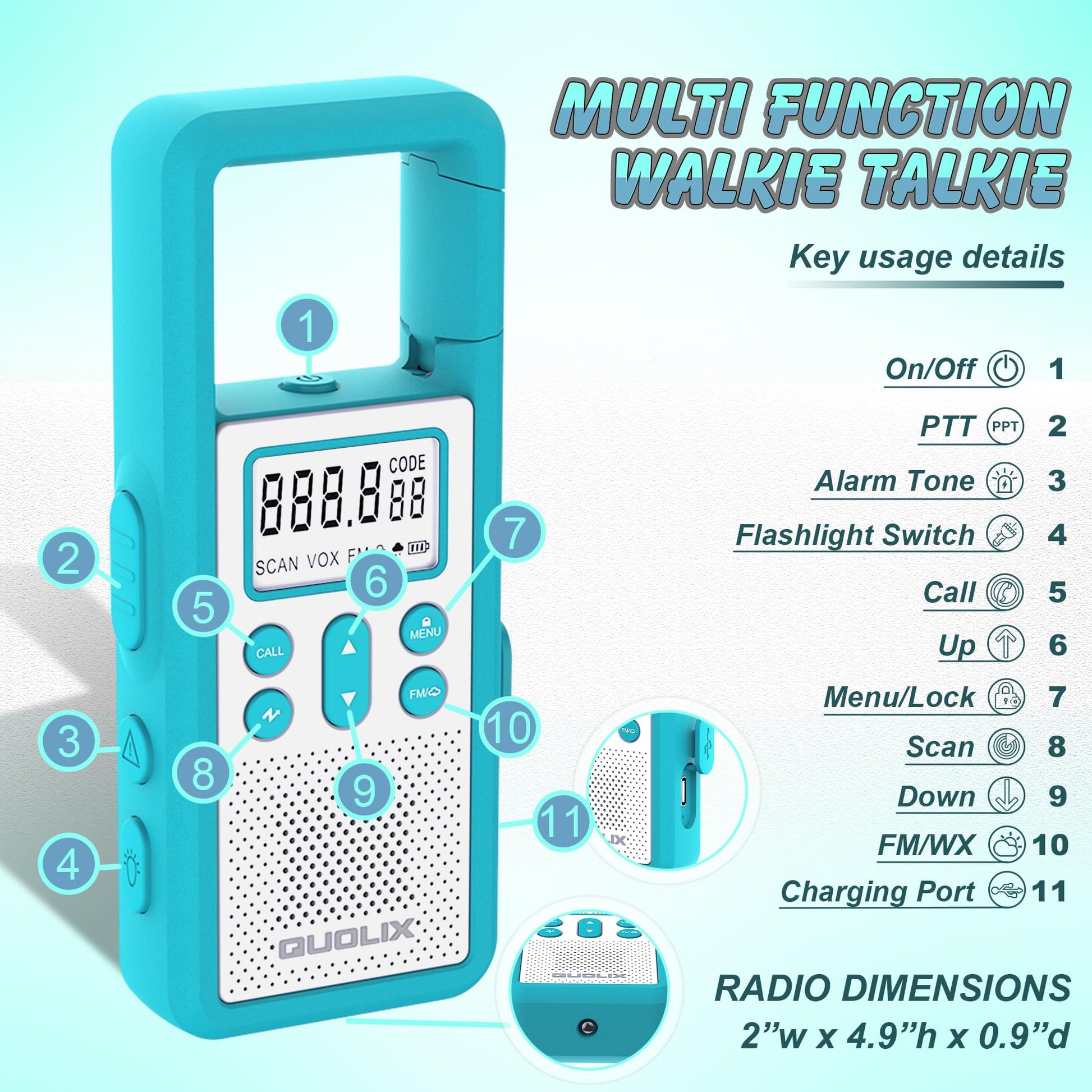 - Q: What safety features do these walkie talkies have? A: The Quolix walkie talkies include a NOAA Emergency Weather Channel for hazardous weather alerts and an SOS siren that can be activated with a button press, ensuring your safety during emergencies.