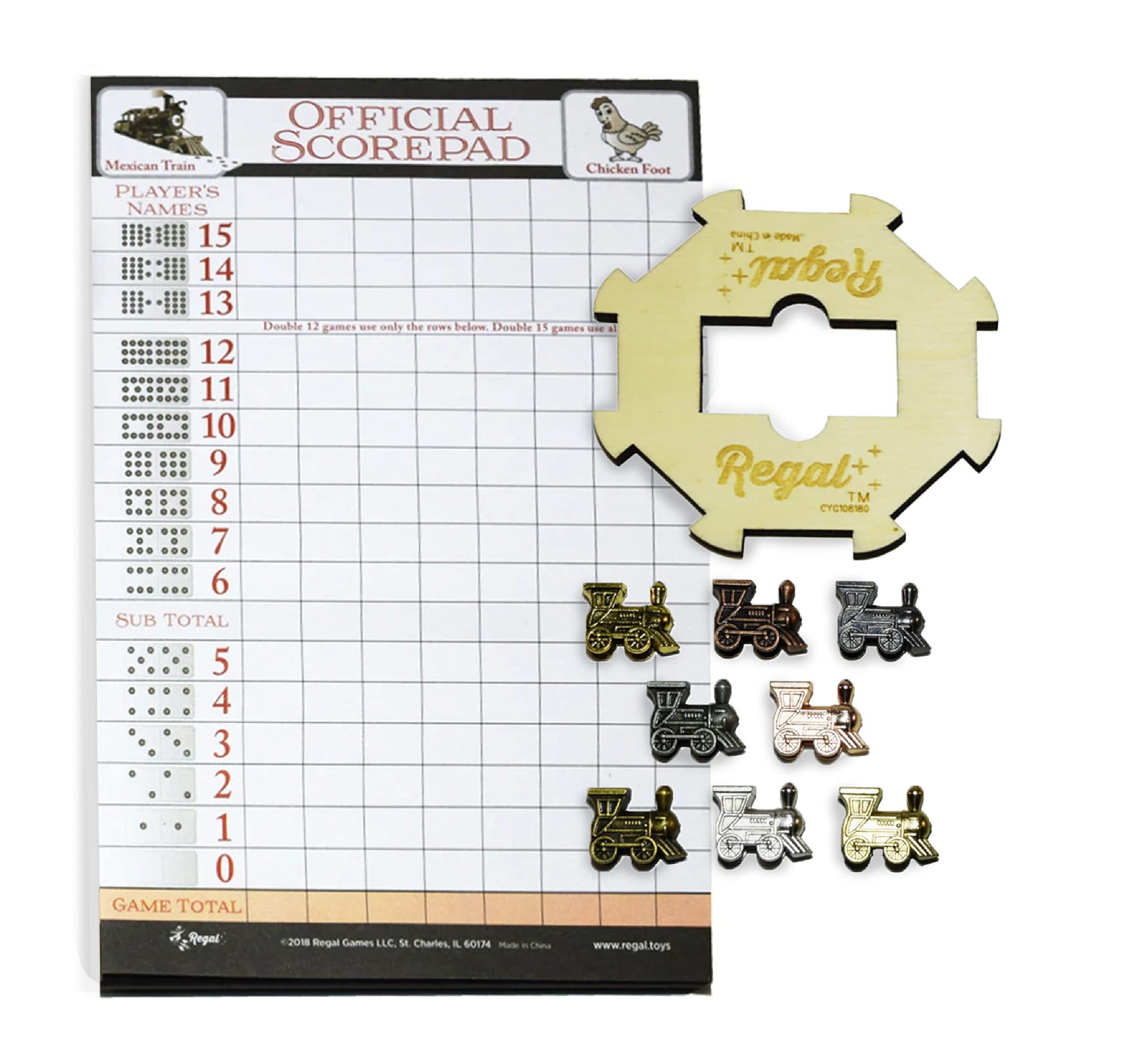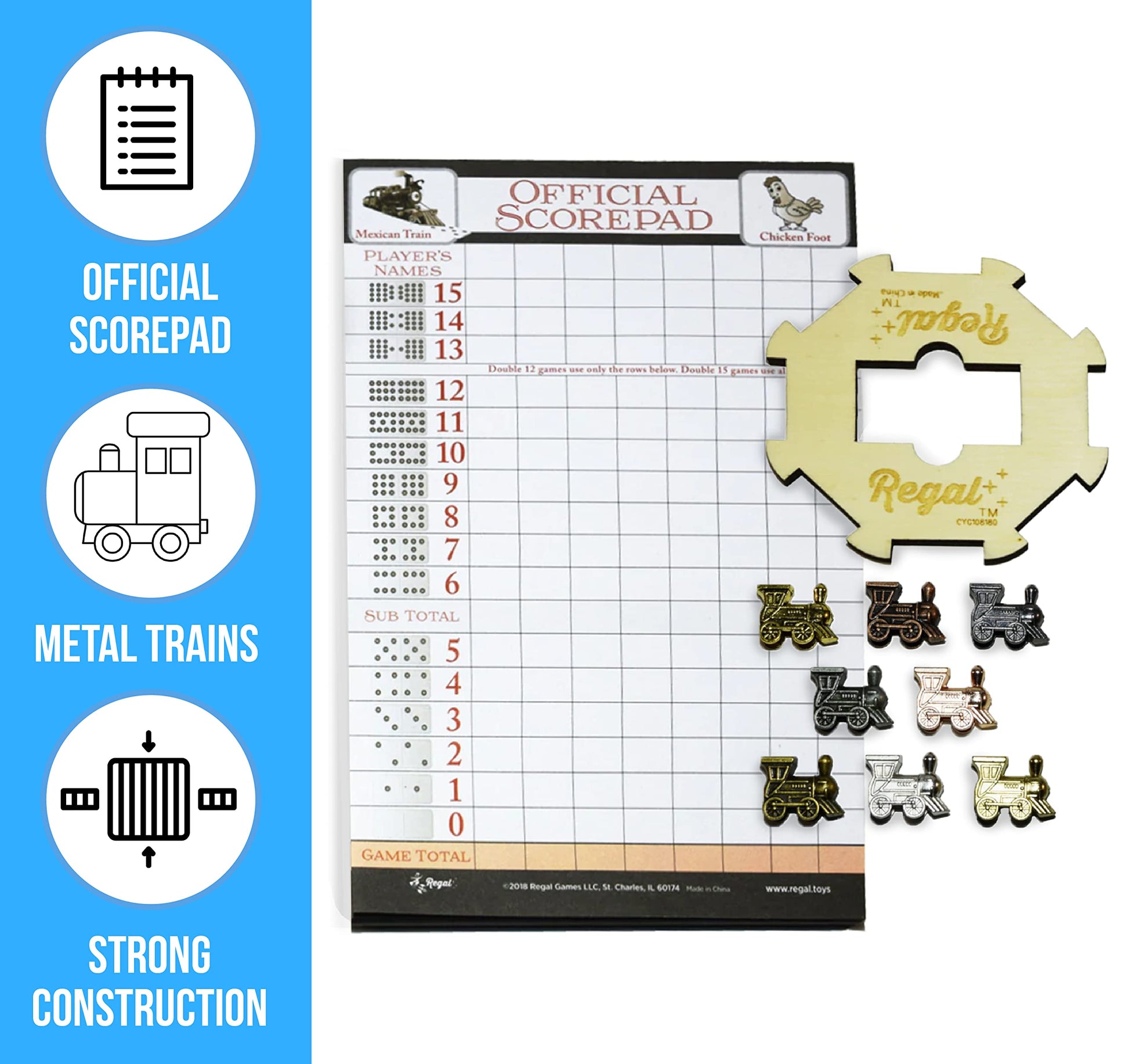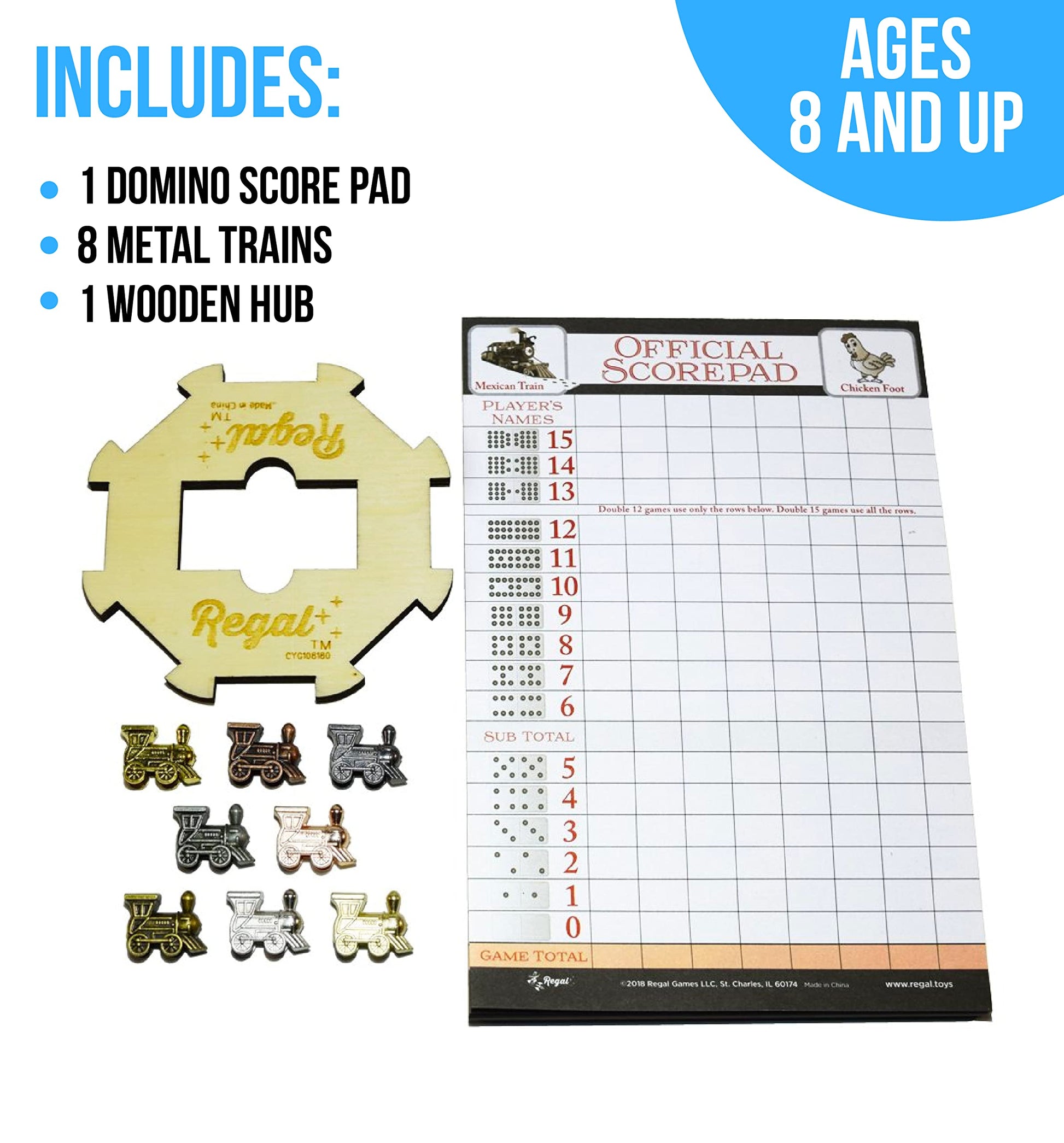 Regal Games Mexican Train Domino Expansion Set - 8 Metal Marker Trains With Unique Finishes - Replacement Wooden Hub - Scoreshee