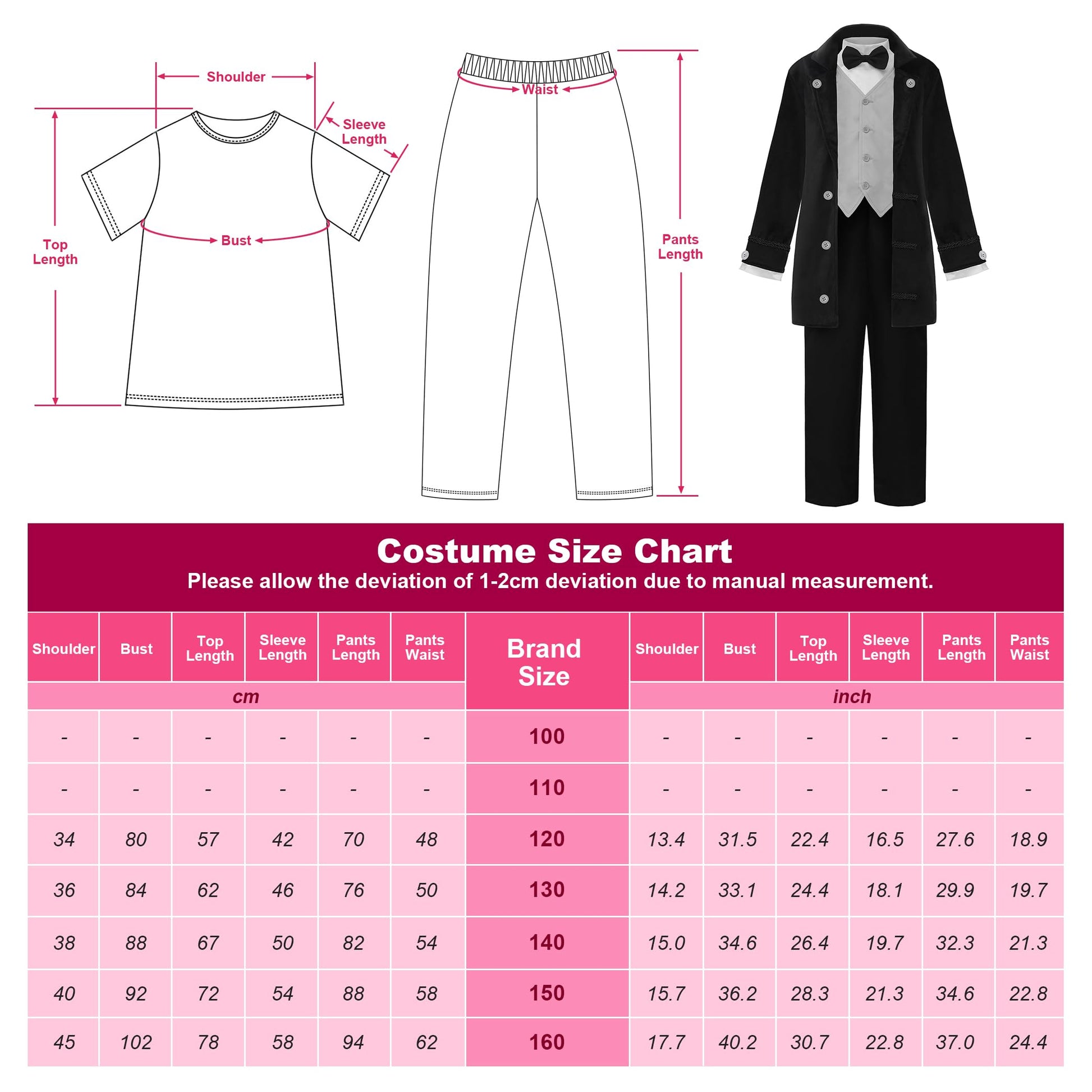 6-7: Shoulder: 14.2, Bust Measurement:33.1, Sleeve Length: 18.1, Waist: 19.7, Jacket Length: 24.4, Trousers Length: 29.9, Hat Circumference: 21.26