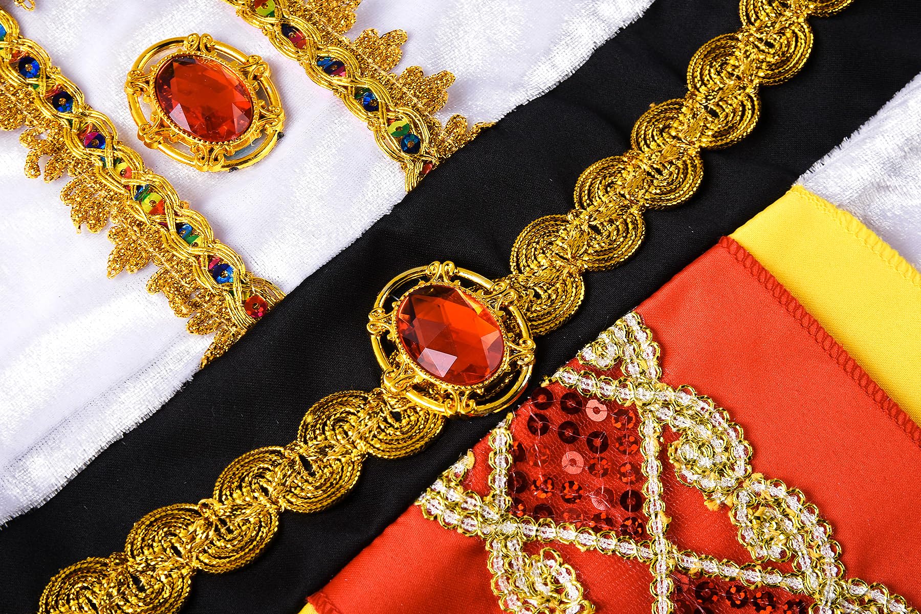 - Q: Does the costume have any special features or decorations? A: Yes, the costume features a striking contrast of black and red colors, golden lace decorations, and gold sequined accents that reflect the ancient Egyptian civilization's aesthetics and add a touch of nobility.