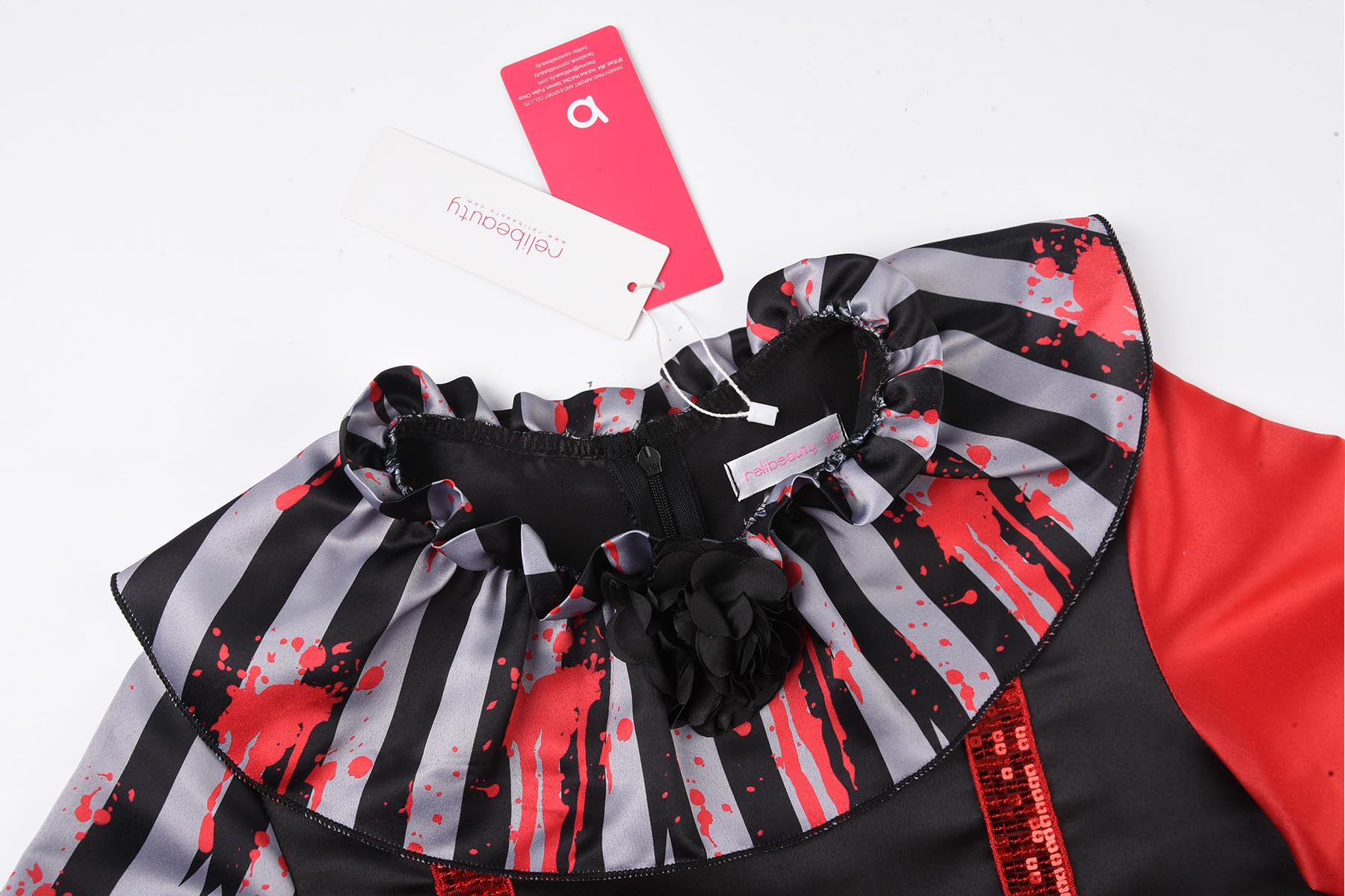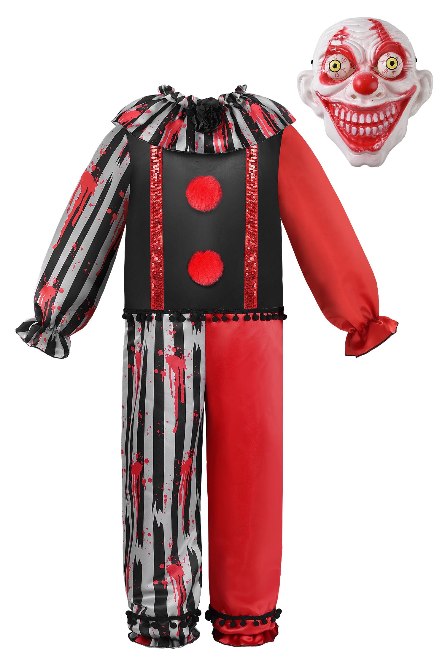 • Q: Does this costume come with a mask, and what is the design like? A: Yes, the costume includes a matching scary clown mask designed with three colors: black, red, and gray, creating a spooky appearance.
