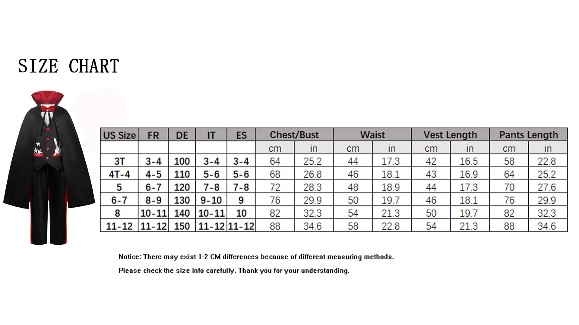 10-12/150:Shoulder Width:13.8 Waistcoat Bust:34.6 Waistcoat Lengt:21.3 Cloak Lengt:38.2 Pants Waist:22.8 Pants Lengt:34.6