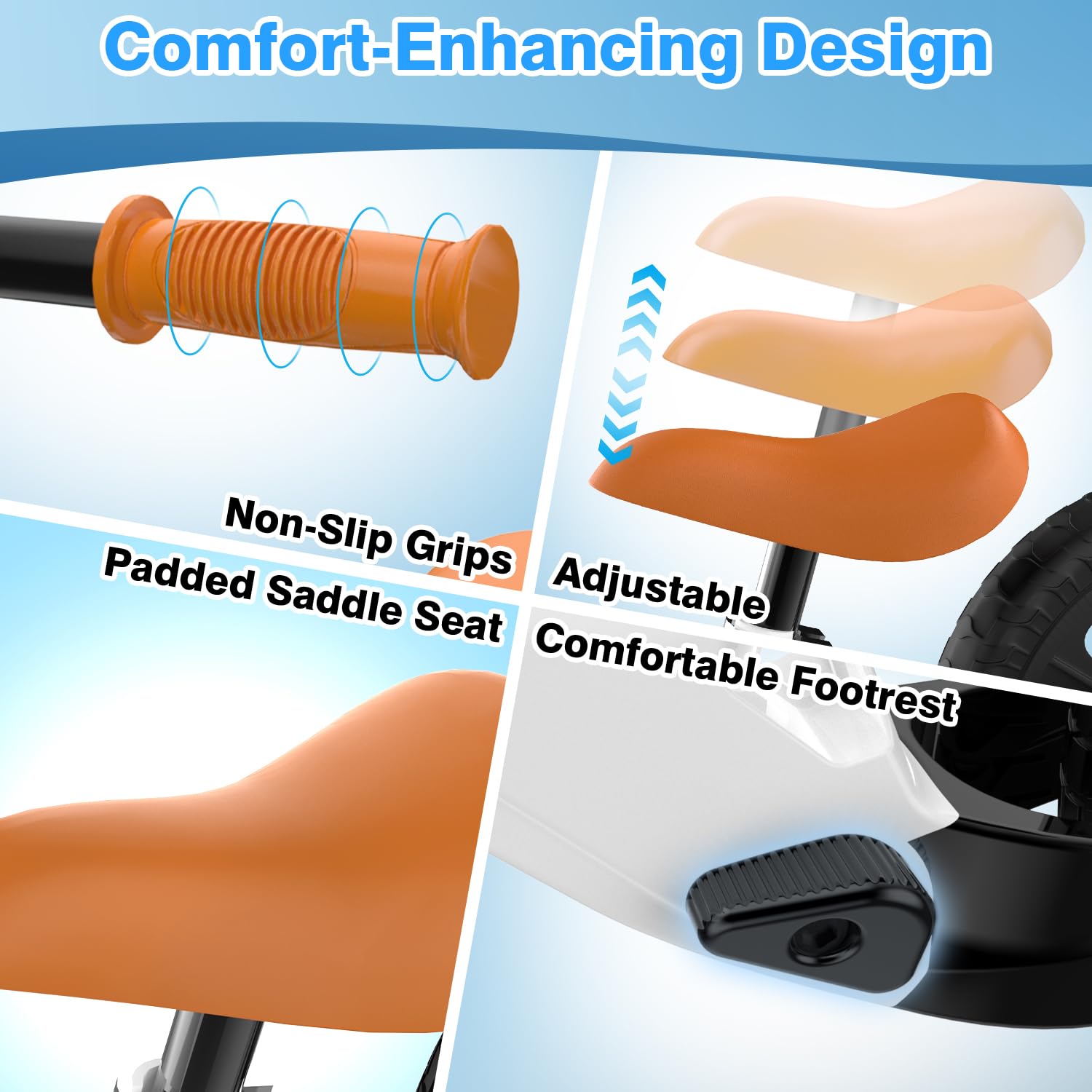 This 12-inch balance bike is ideal for kids aged 2 to 5, helping them develop cycling skills with ease. Featuring maintenance-free EVA foam tires, it provides a smooth, stable ride on various surfaces. The lightweight, durable frame supports up to 110 lbs and is easy for kids to handle. With an adjustable seat, footrest, and non-slip handlebars, it's designed for comfort and control. A perfect gift for young adventurers, encouraging confidence and fun outdoor exploration!