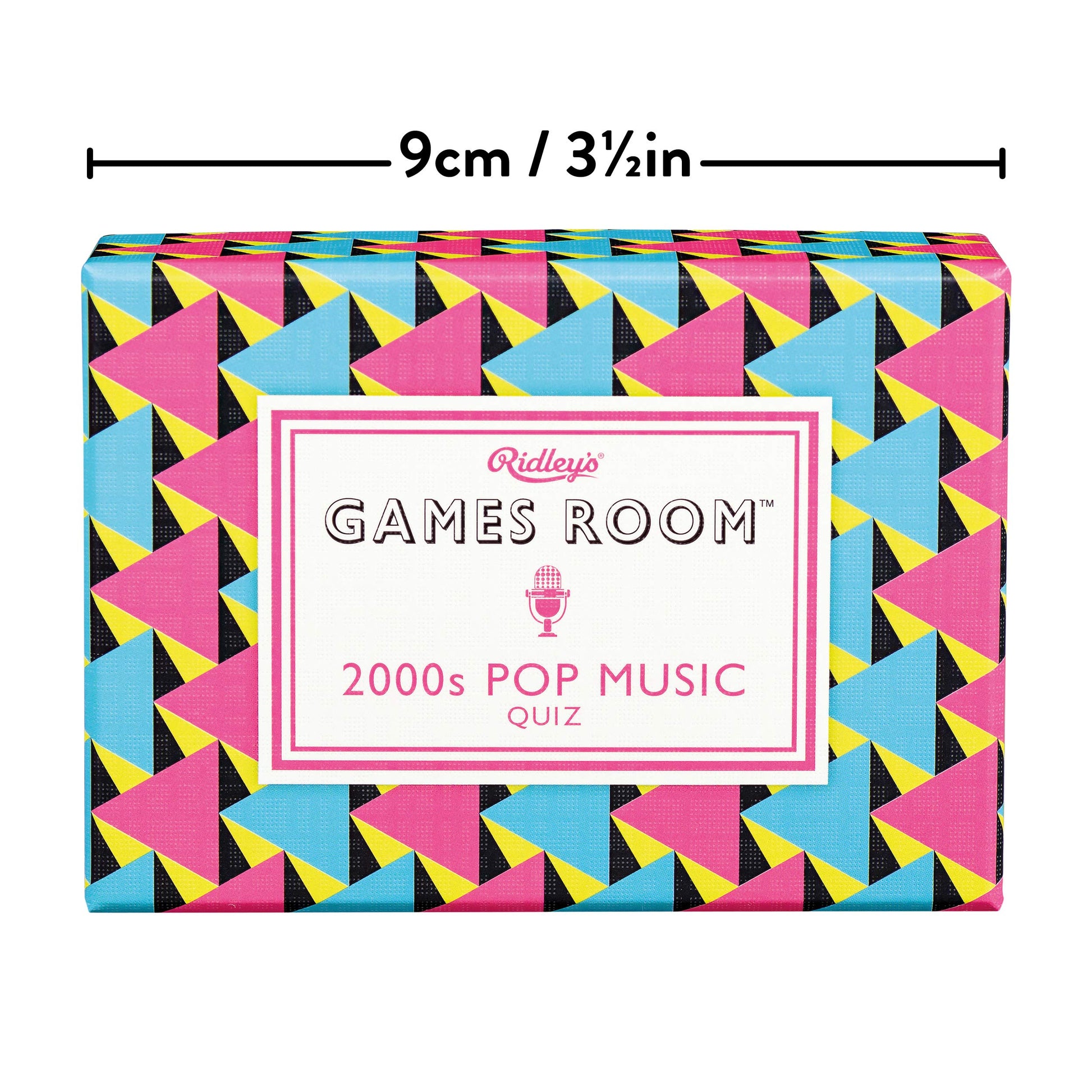 - Q: What is included in the 2000s Pop Music Trivia Card Game? A: The game includes 40 trivia cards featuring music questions and next line challenges from popular songs, albums, and artists of the 2000s. It also comes in a sturdy retro cassette tape storage box, measuring 4.25” W x 2.75” L x .75” H.