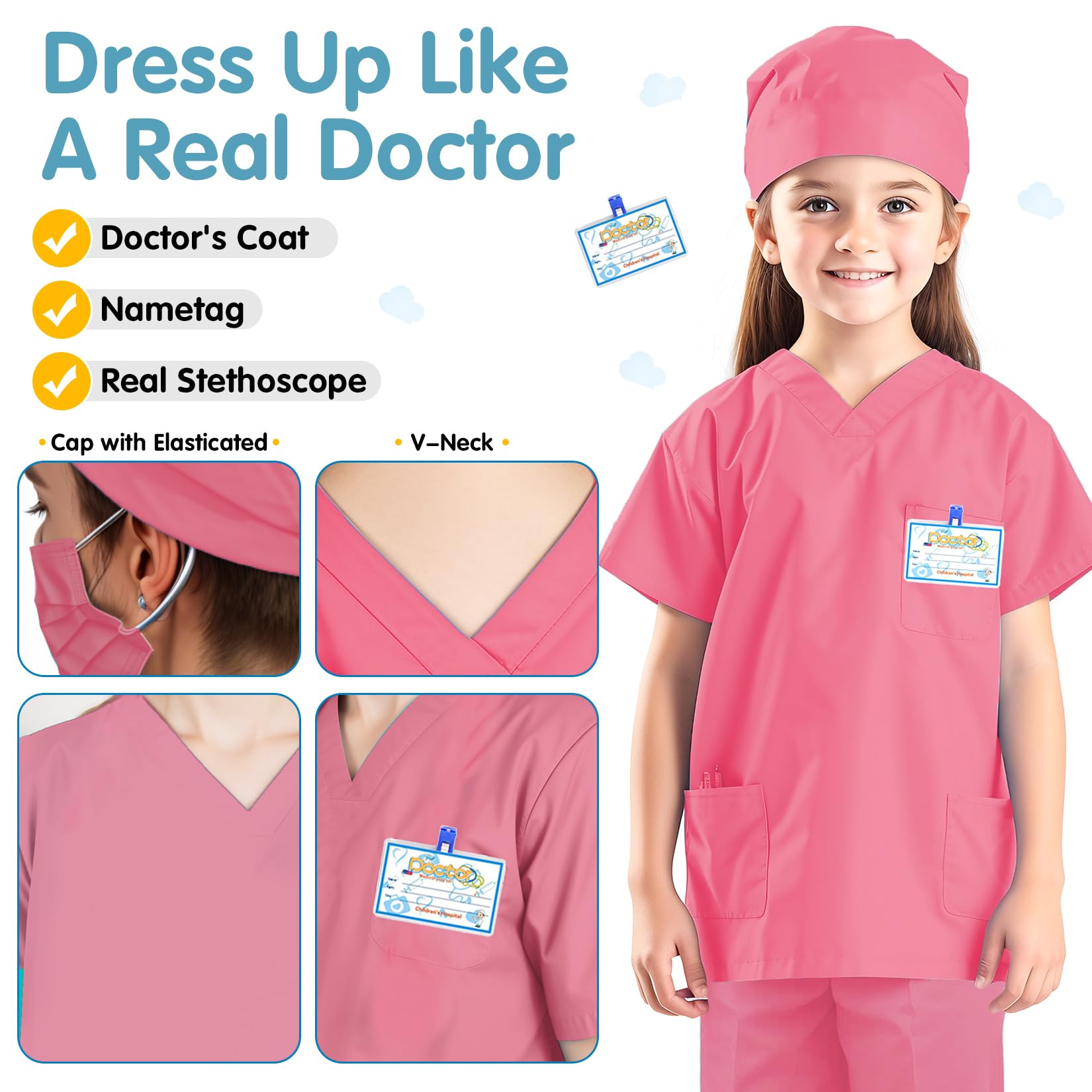 Doctor Scrubs 5pc set:top*1,trousers*1,cap*1,mask*1,Name tag *1 Size:Suitable for children aged 3-11 Years.Please select the right size before purchasing. Material:Polyester65%,Cotton35% ;Super Soft Kids Doctor Set.Soft fabric, comforable to wear. Real doctor cosplay:V-neck Top,Dolman Sleeves,Chest Pocket,2pc*Front pocket. Occasion:this costume is great for Doctor cosplay,Hospital theme party,Lab,Halloween,Christmas dress-up,stage performance,role play,photo prop,Birthday party,and costume parties.Playtime Every day and More!