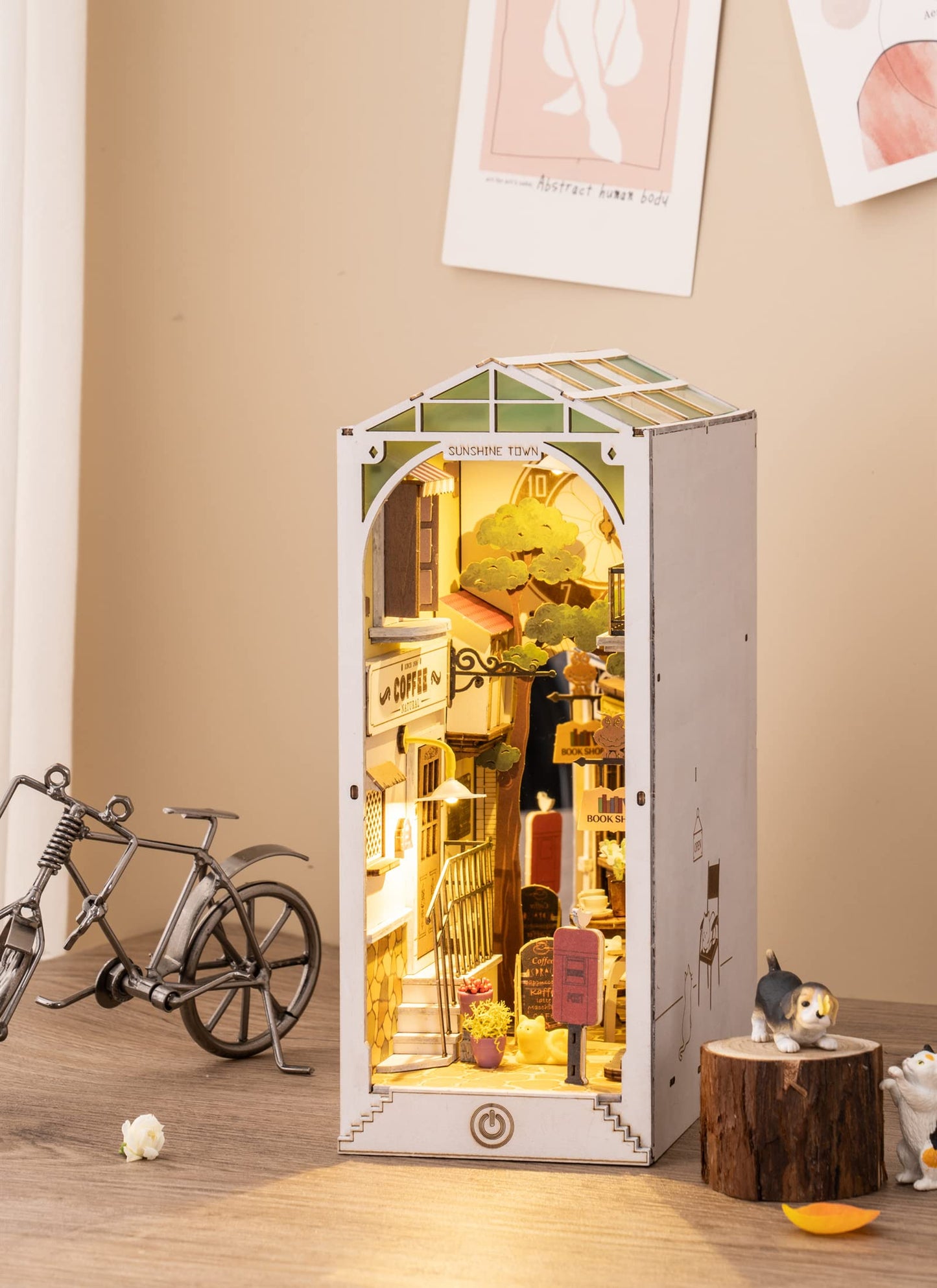 ROBOTIME DIY Book Nook Kit Bookend Stand Bookshelf Miniature House Kit with Sensor Light 3D Wooden Puzzle Model Building Kit (Sunshine Town)